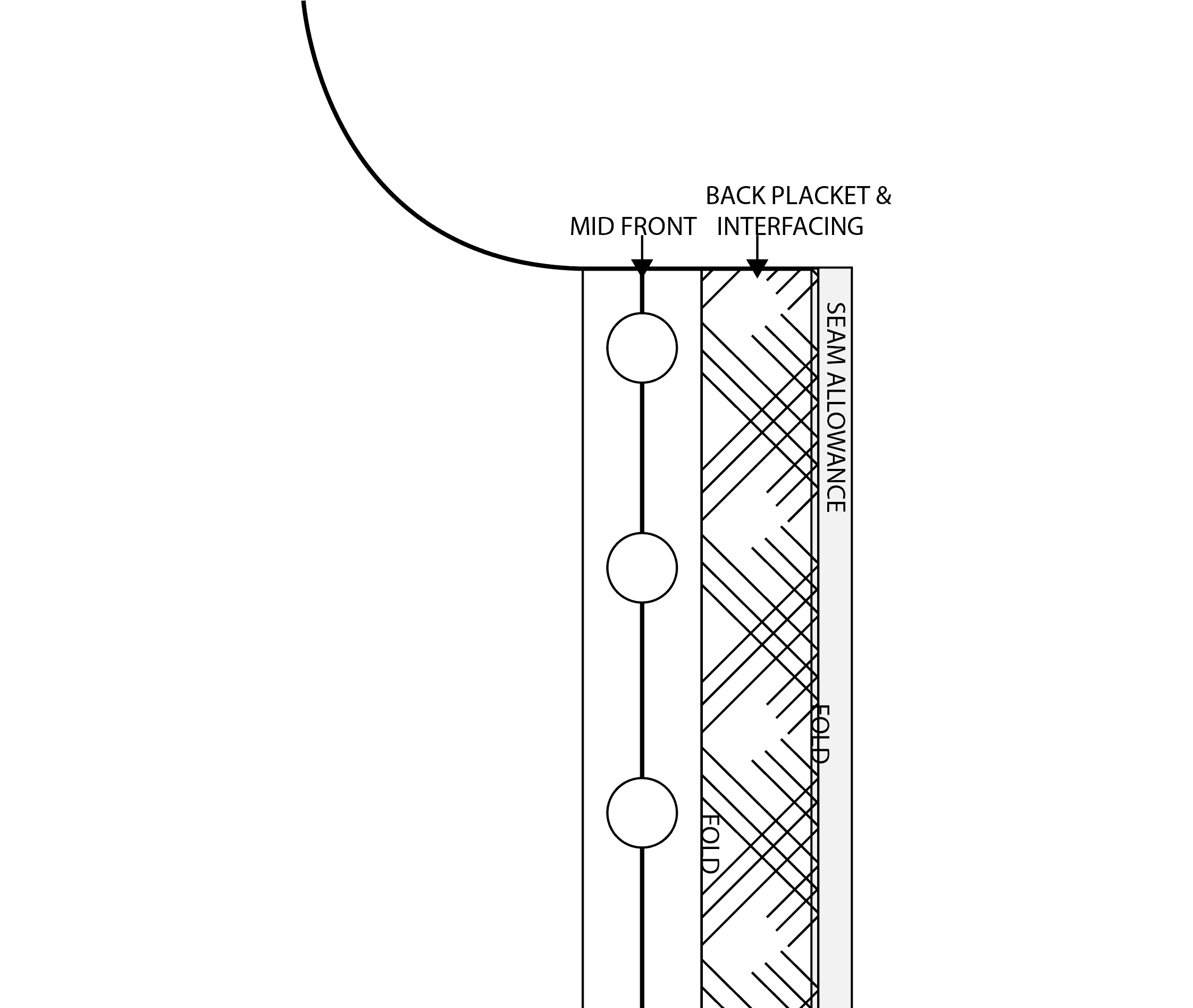 I am interested in how high the placket sits above the neckline and below the hem before the waistband and collar pieces are added. You show it after it is sewn up but I’m not sure the order in folding them over onto each other at the top in the bottom of the pockets.