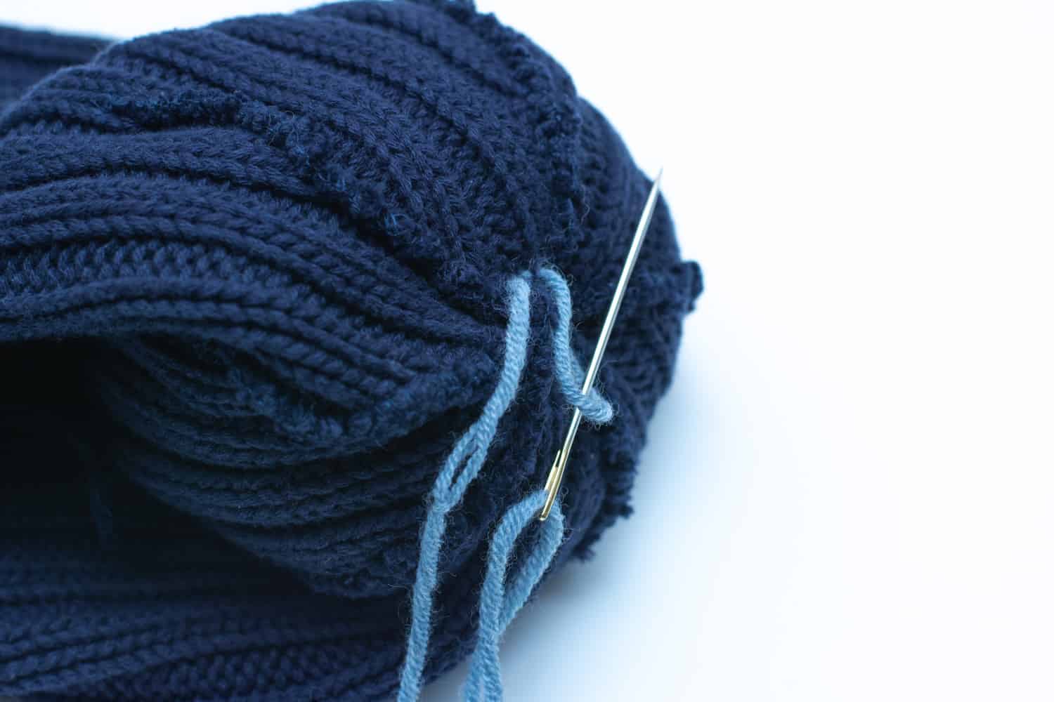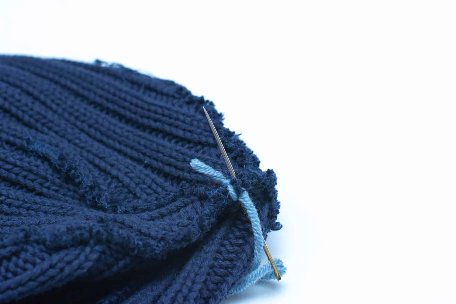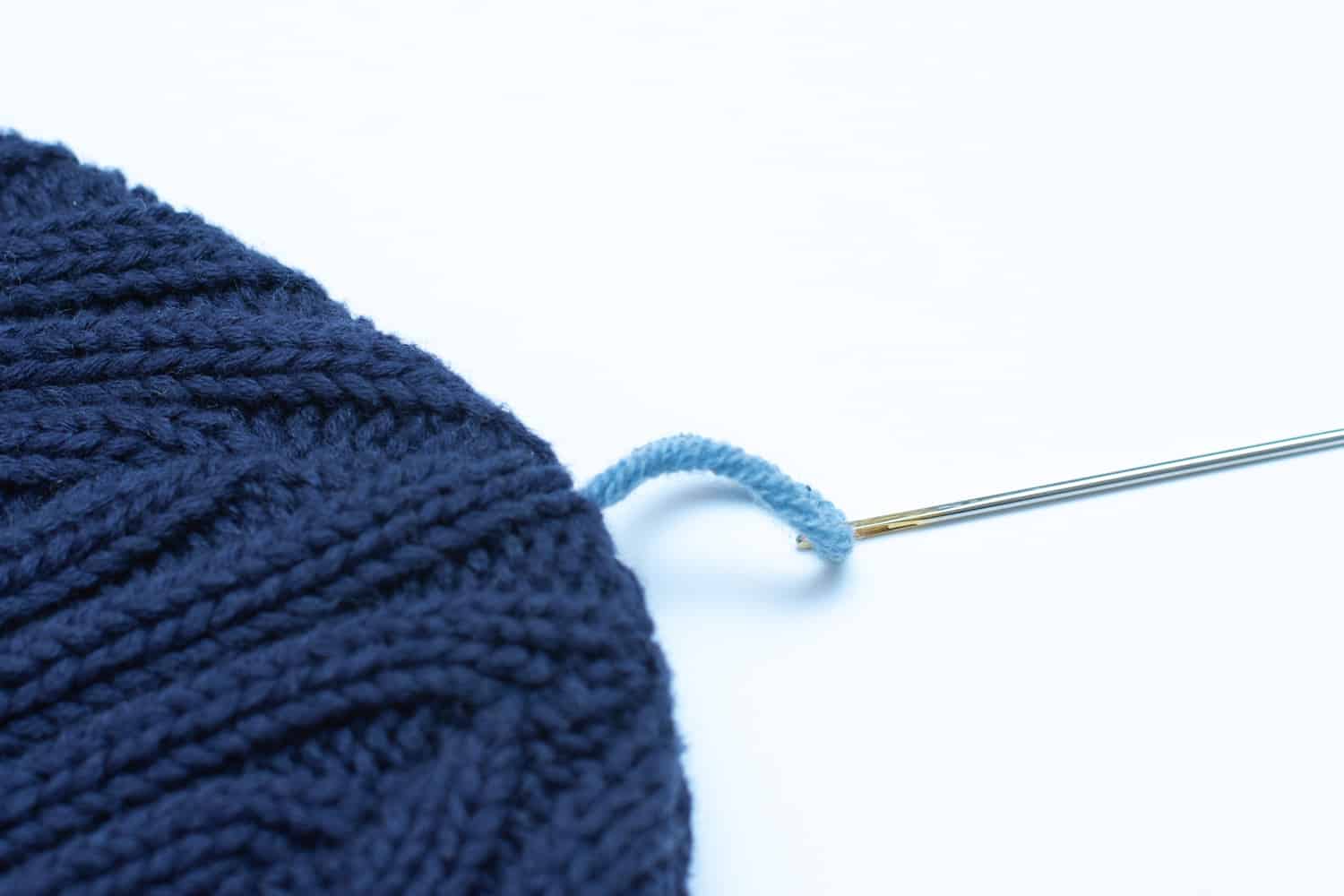 Insert the needle on the inside, if you are using the Brisa Beanie or Ullvi knit hat sewing patterns, just attach the yarn in the seam allowance.