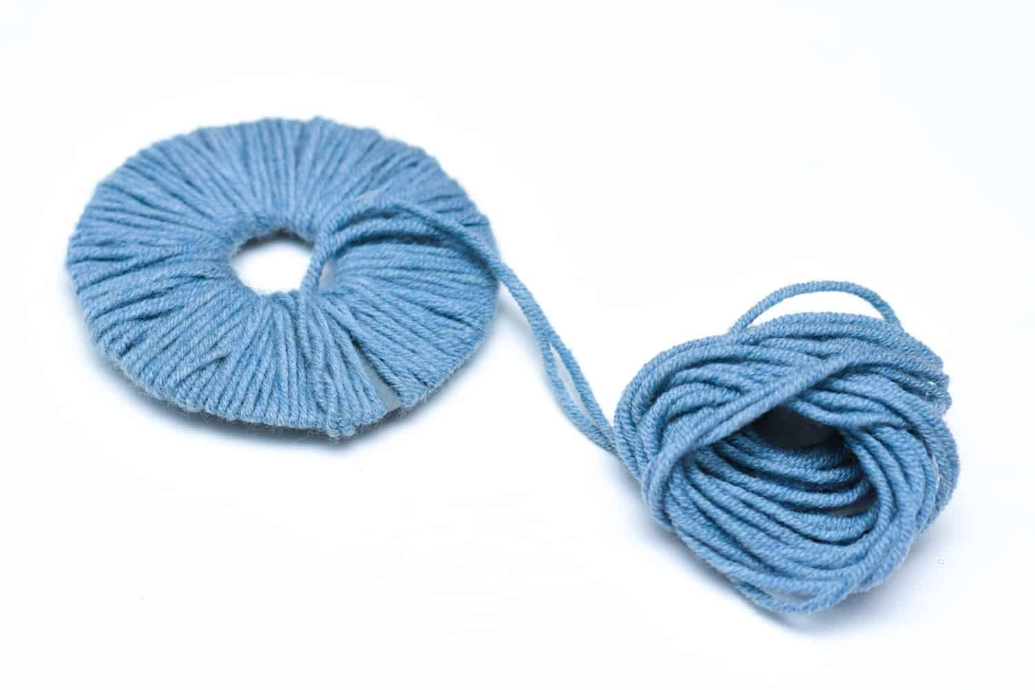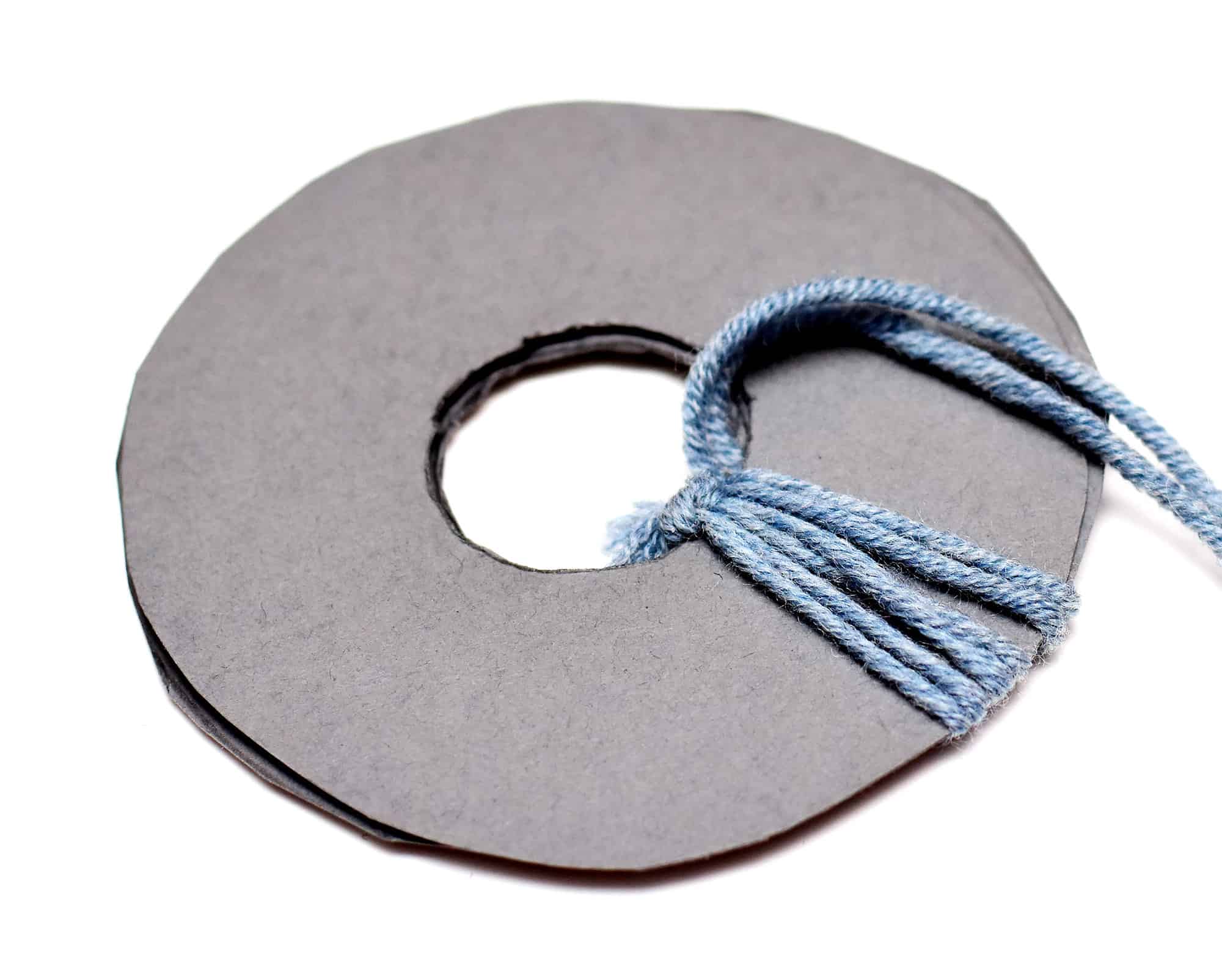 Put the two paper rings together and start wrapping the yarn around the ring. I prefer to use double strands of yarn as it makes wrapping faster. I attach the yarn by tying the ends and then pulling them through the loop which is created when the yarn is folded in the middle.