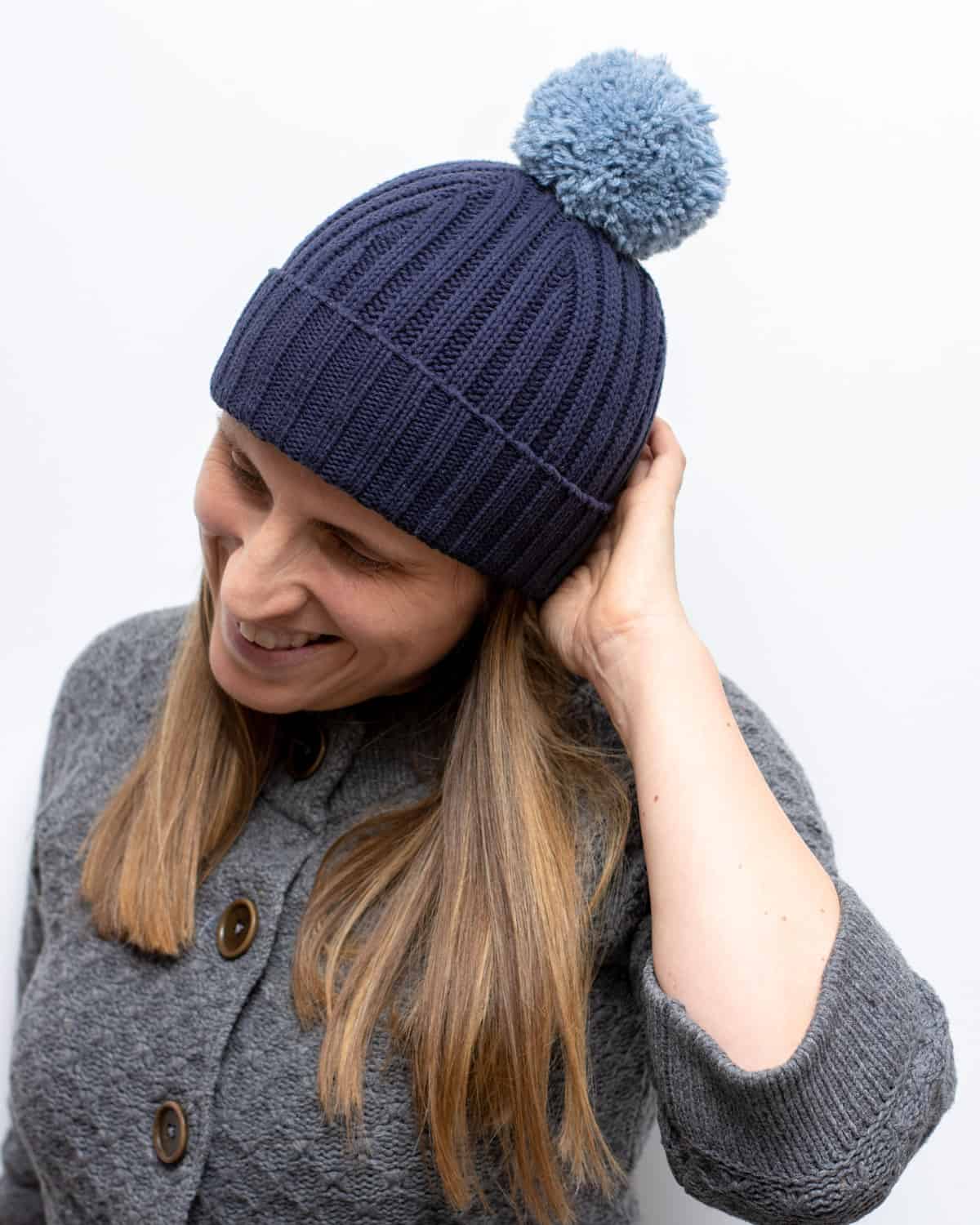 The finished pom-pom attached to a Brisa Beanie made from a recycled sweater (check out my tutorial for how to make a knit hat using a sweater)