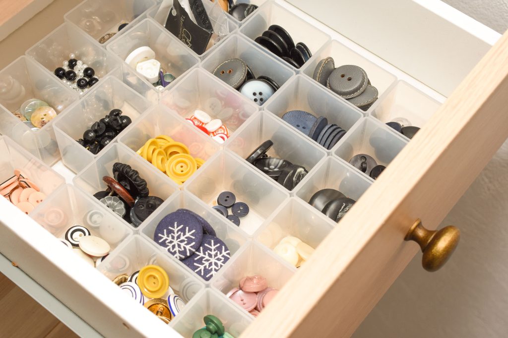 The number one secret to great organising is to have a dedicated spot for everything. The more specific each container is, the better. This is why most of my sewing notions and tools are placed in small plastic bins and similar inserts.