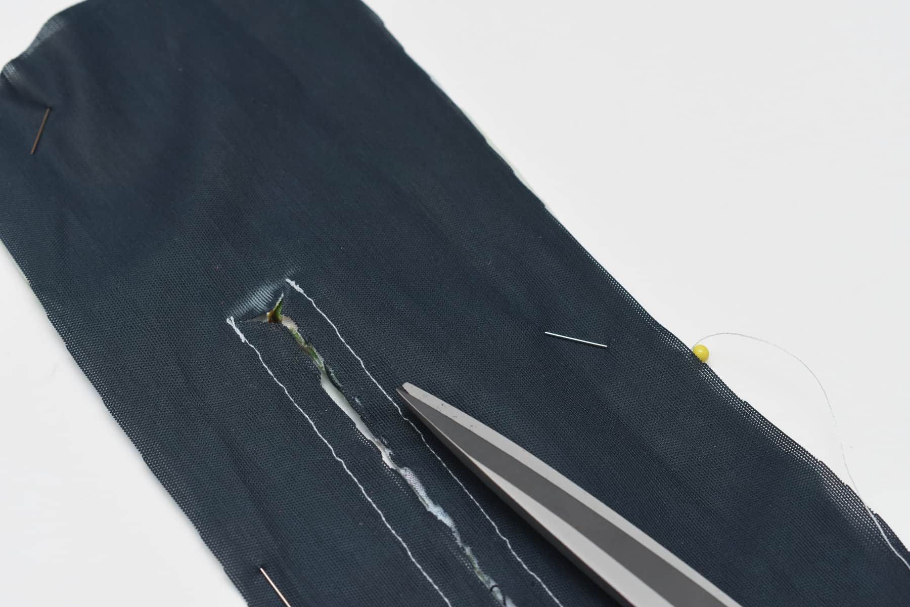 The stitching should be as long as the opening, don’t sew the entire welt! Make sure you follow the markings and that you sew exactly in the middle of the welt. You can put needles outside the seam area to keep the welt in place.