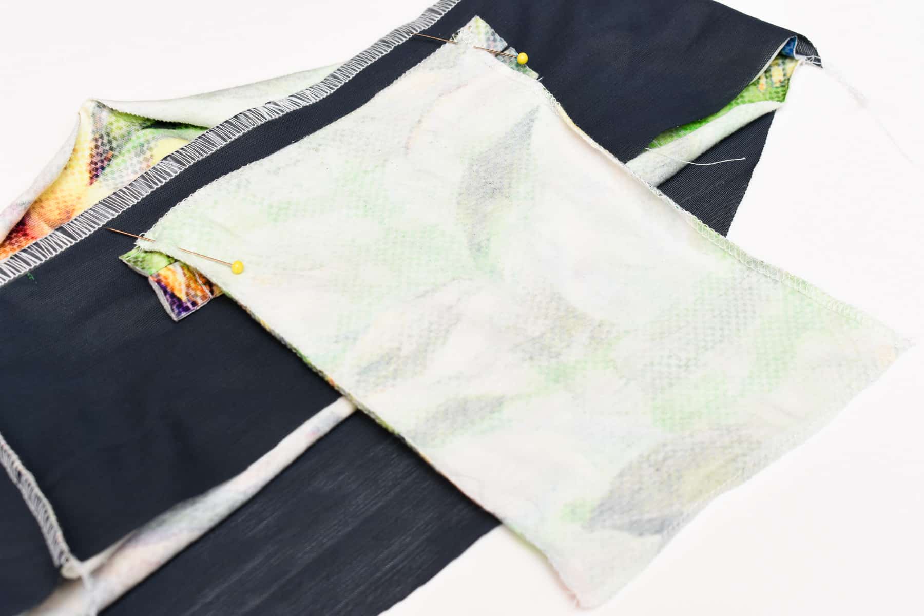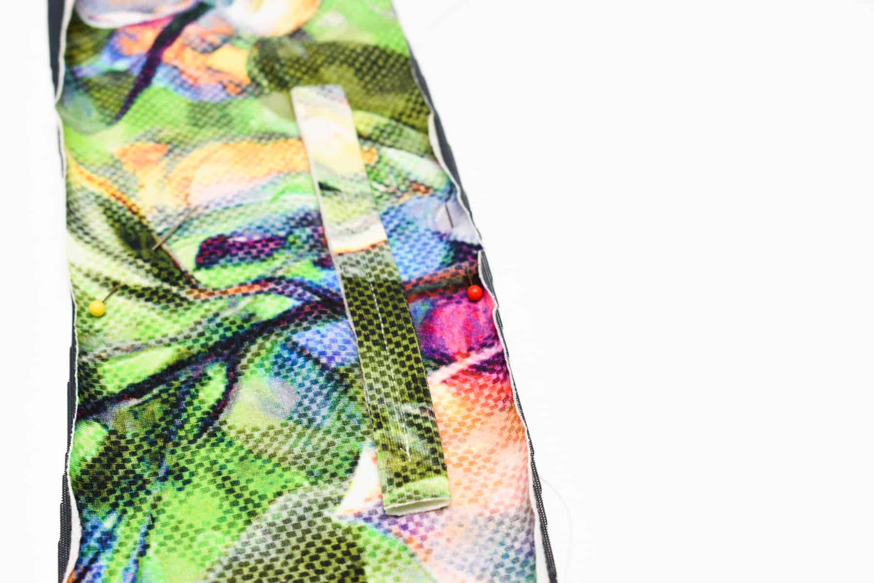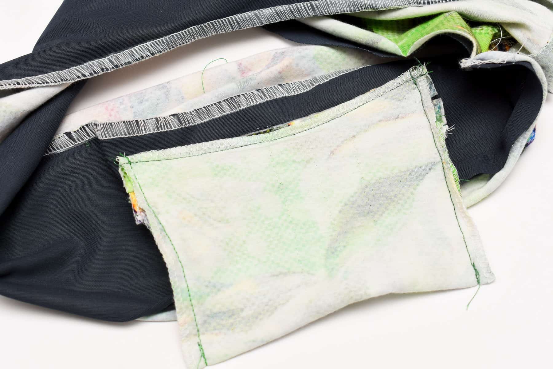 For best result, stabilise the outside waistband pieces with power net underlining. Check out my tutorial How to sew a body shaping waistband using power net to see how it is done, note that in this instance I add the net to the outer waistband and not the inner that is described in the tutorial. You can also use regular fusible interfacing around the opening or if you are used to sewing with knits you can probably skip interfacing and just use your hands to keep the fabric from stretching out.