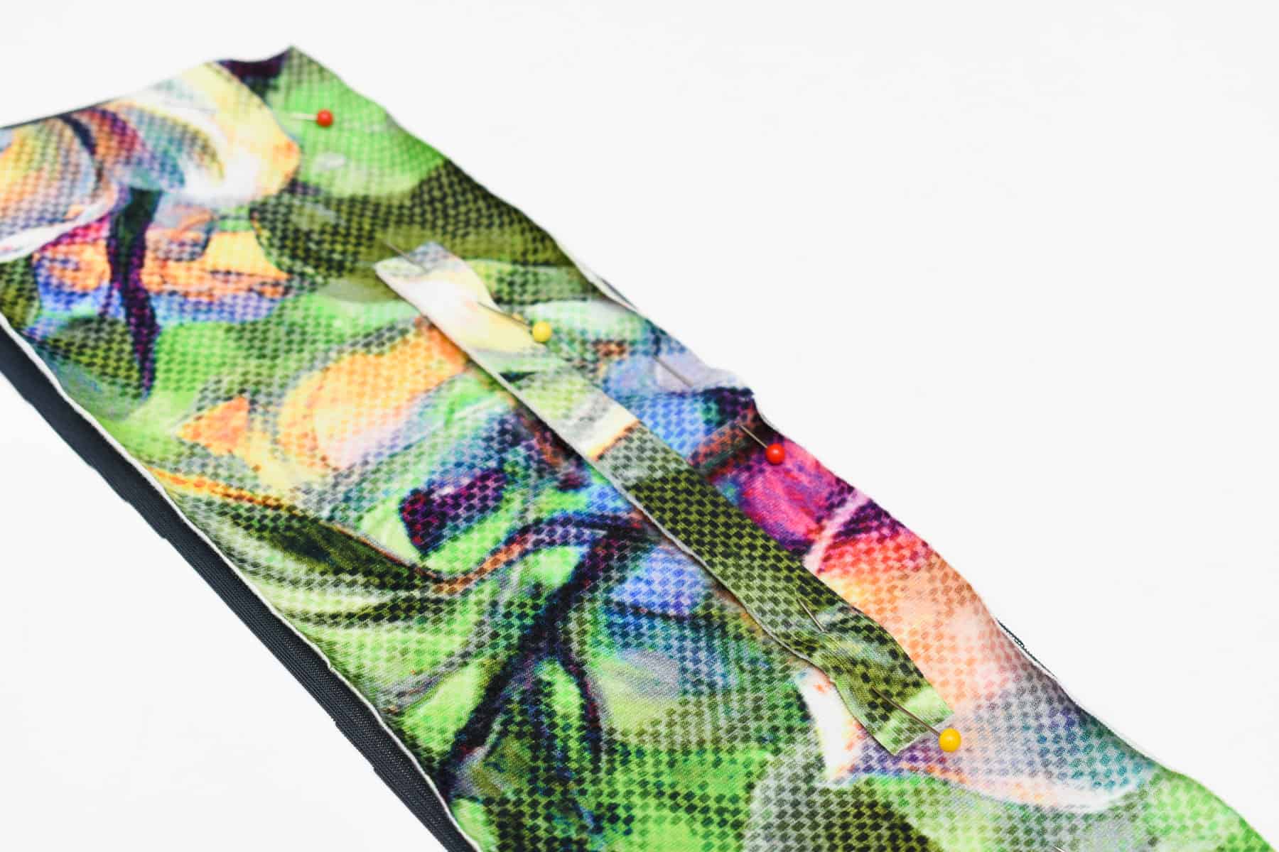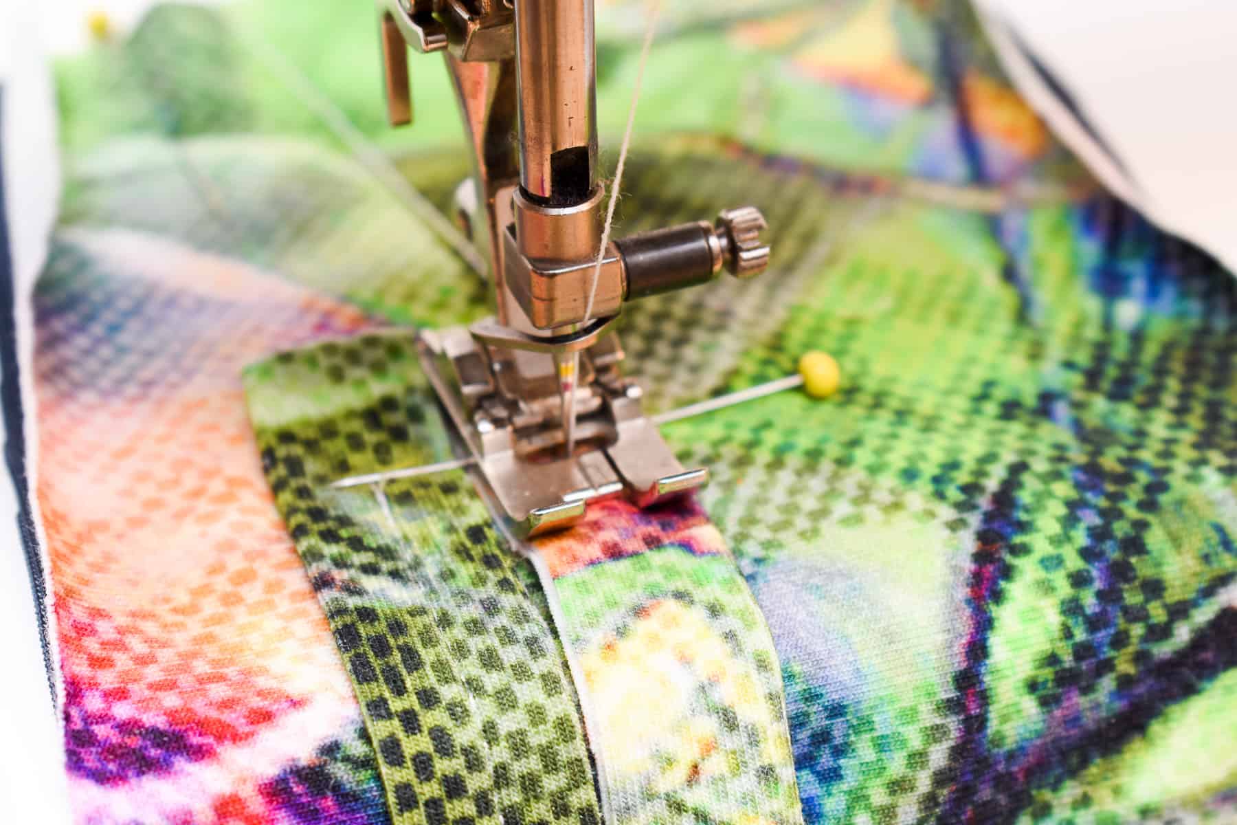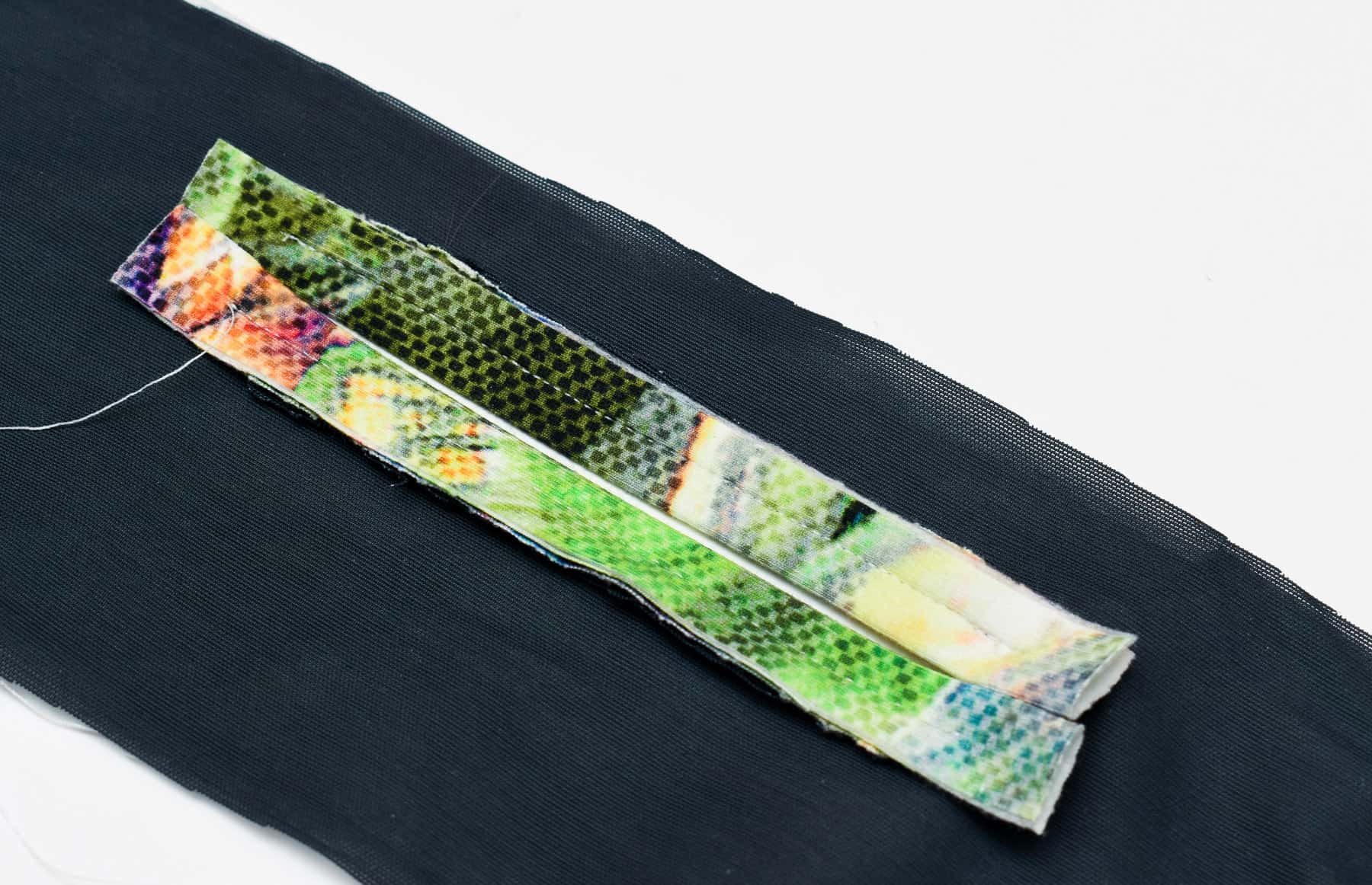 For best result, stabilise the outside waistband pieces with power net underlining. Check out my tutorial How to sew a body shaping waistband using power net to see how it is done, note that in this instance I add the net to the outer waistband and not the inner that is described in the tutorial. You can also use regular fusible interfacing around the opening or if you are used to sewing with knits you can probably skip interfacing and just use your hands to keep the fabric from stretching out.