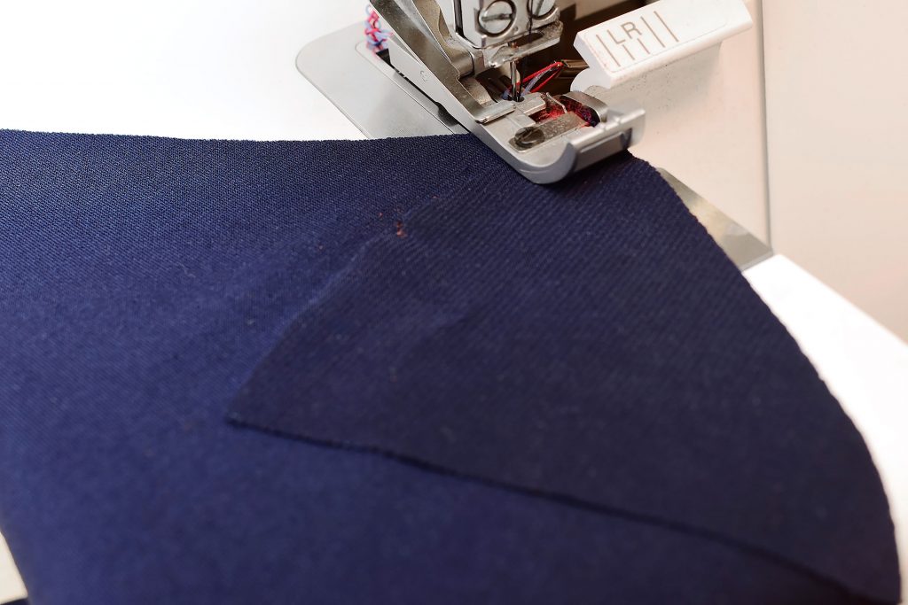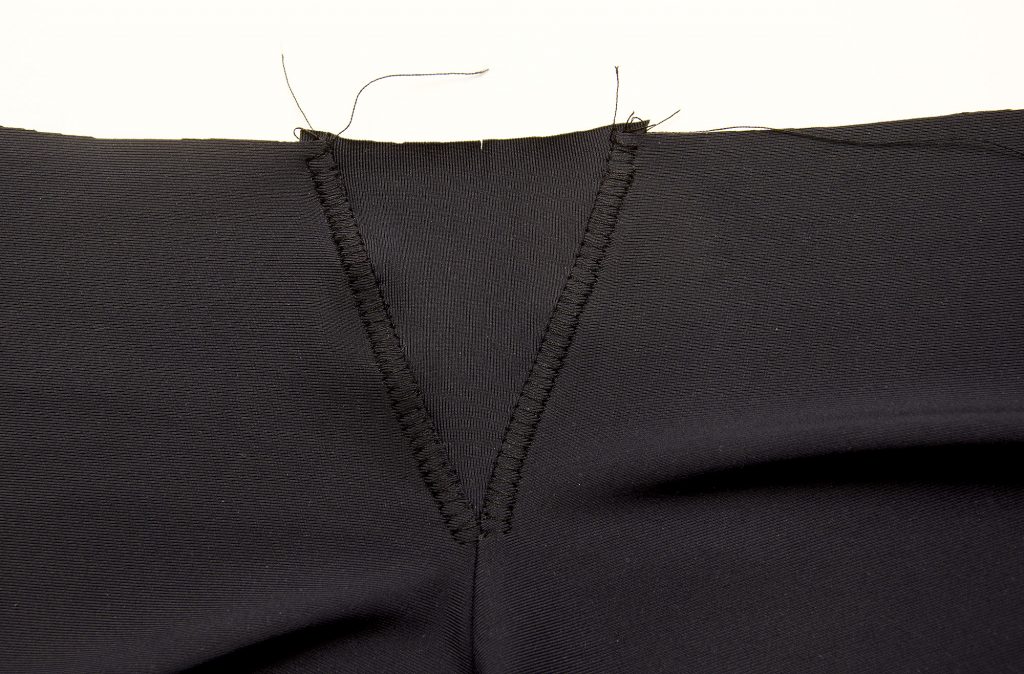 With this method, you’ll sew the crotch seam and the other side (leg) of the triangle gusset in one continuous seam. Place the back crotch pieces together and start from the base of the triangle and sew to the waist. Make sure the opposite seam allowance on the gusset is folded outwards.