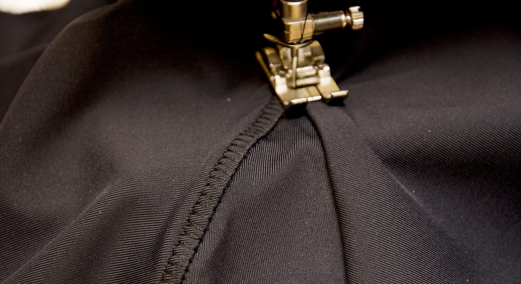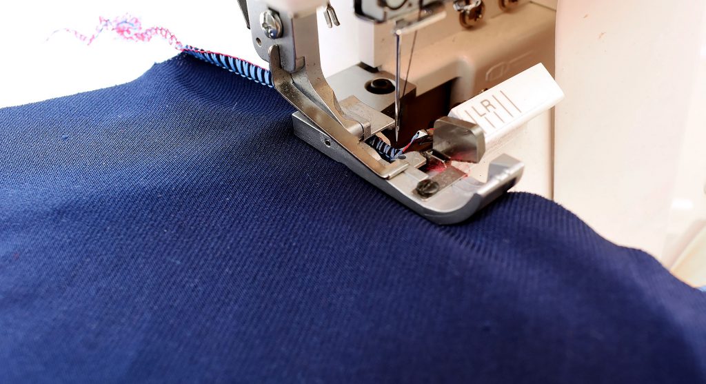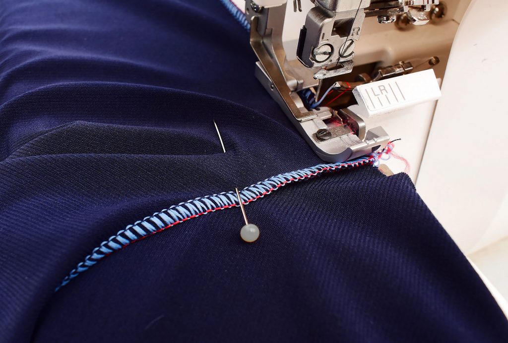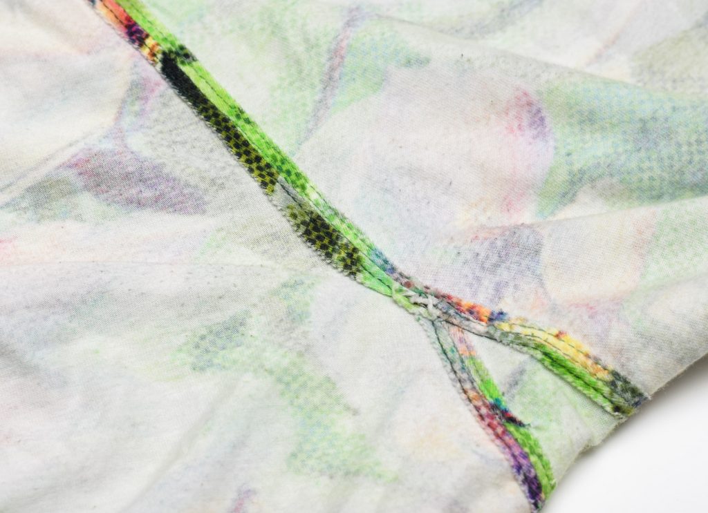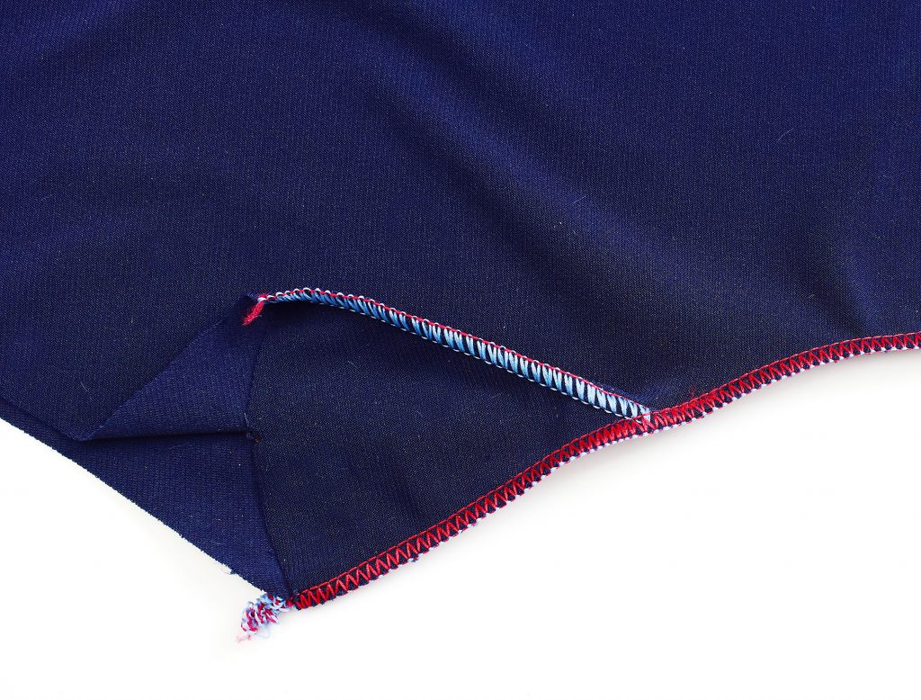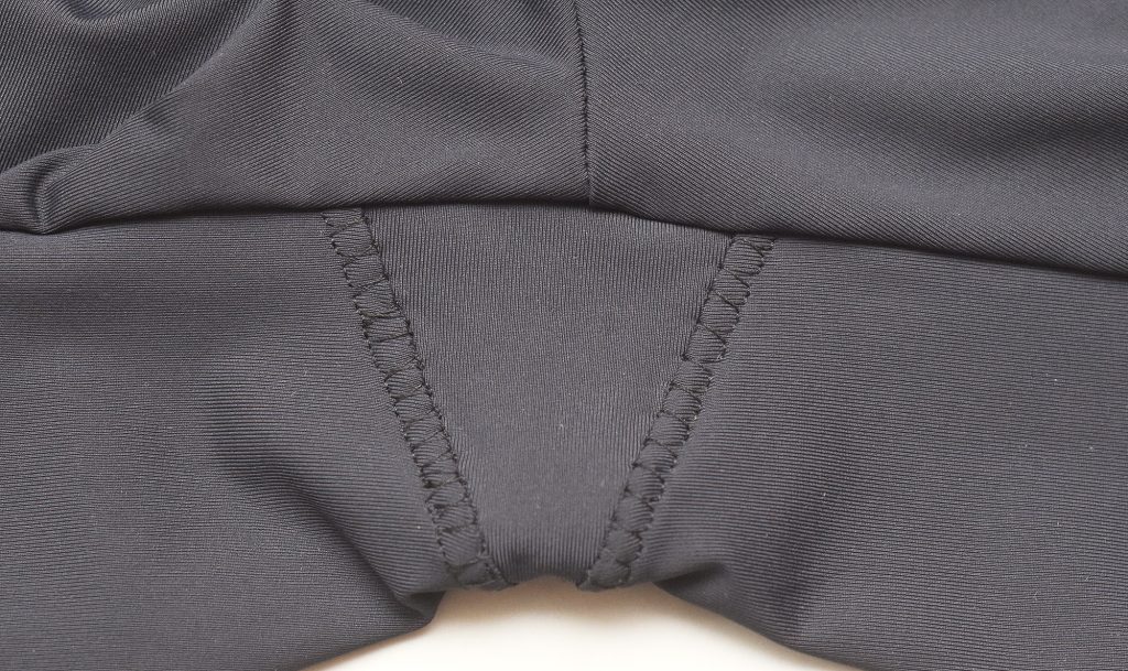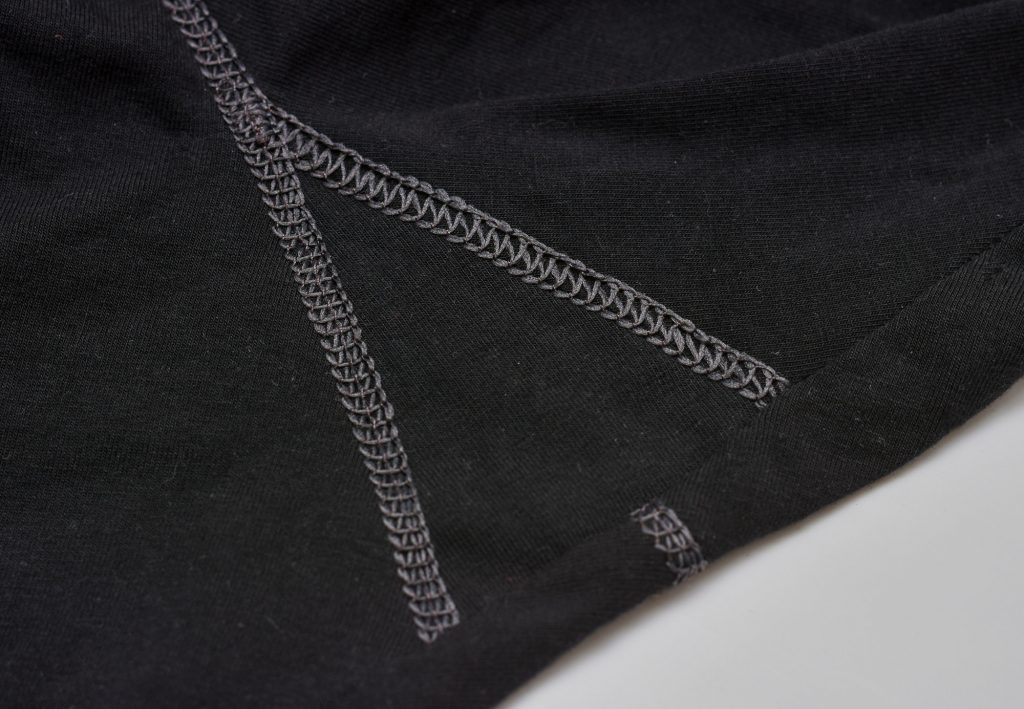 Another option is to sew the crotch seams using a zigzag stitch and then press the seam allowance apart. This will make topstitching easier since the seam is much less bulky. In this example, I’m using the 3-needle coverstitch to crate a mock-flatlock effect. But you can also use a decorative sewing machine stitch.