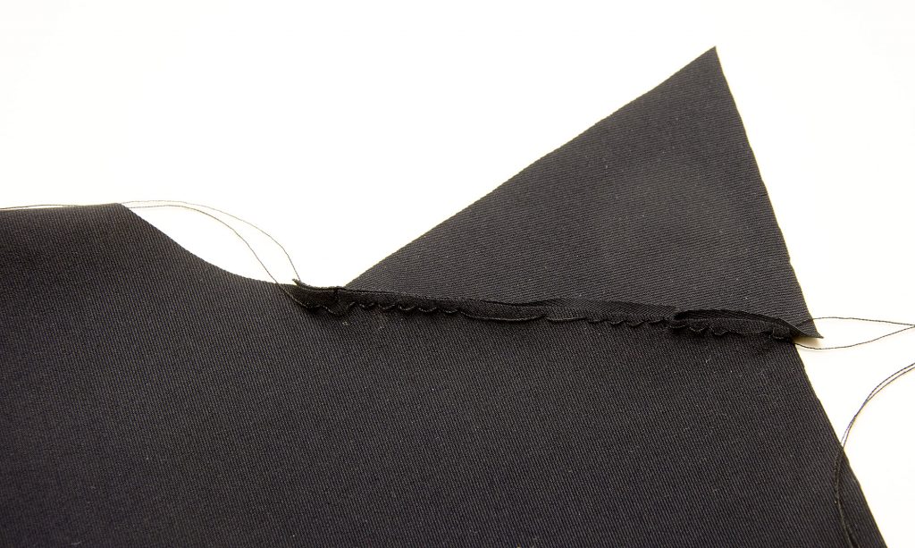 Sew the gusset from the base of the triangle to the tip using a stretch stitch or a narrow zigzag stitch. Stop sewing when you hit the tip of the triangle. This will be easier if the gusset layer is on top when you are sewing.