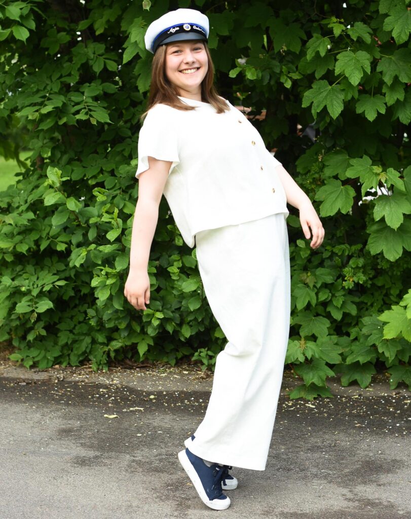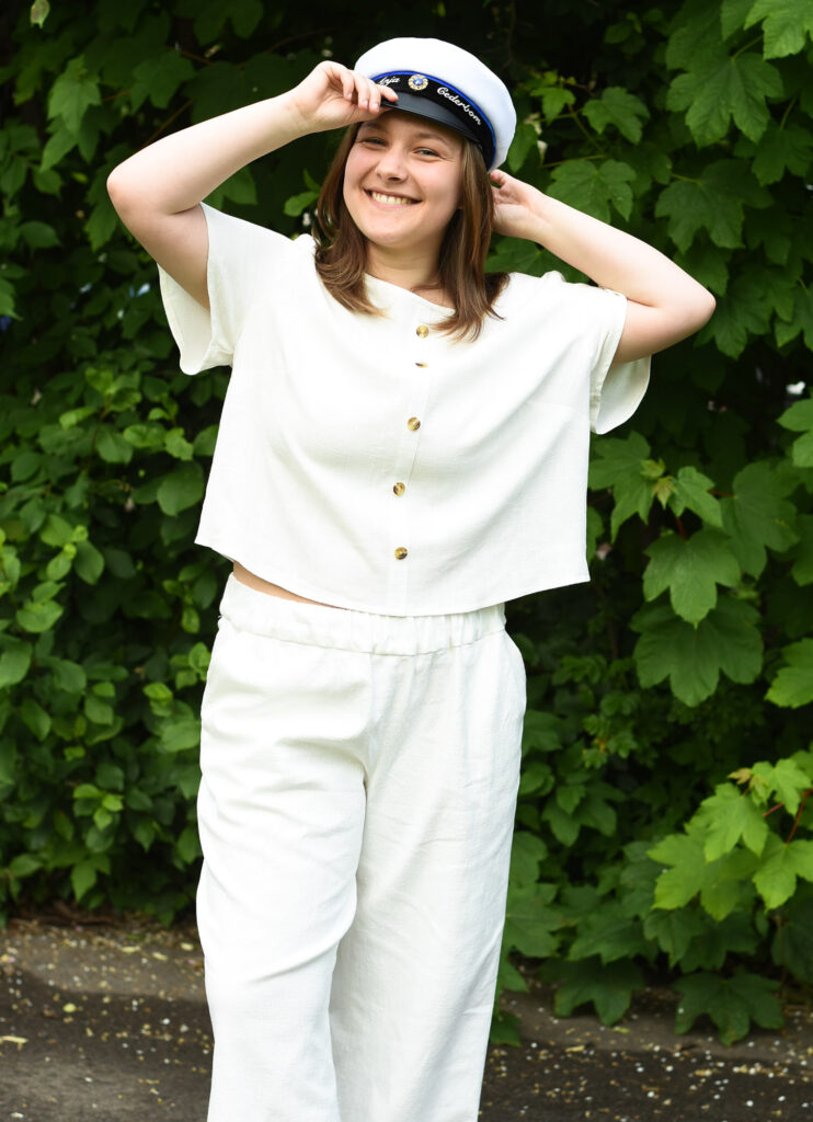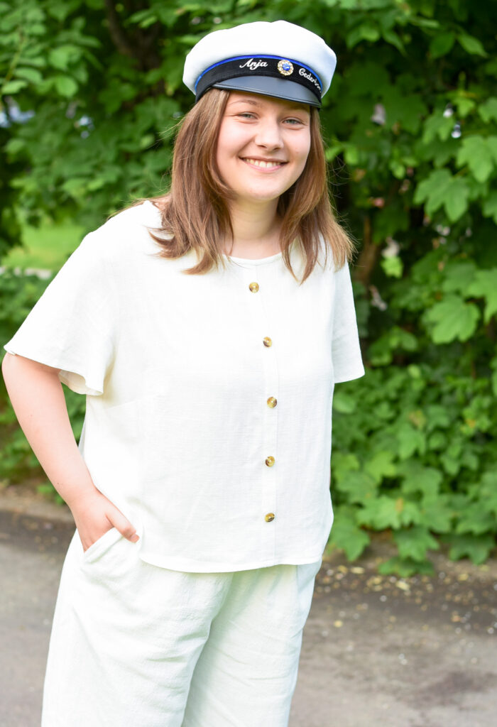 In Sweden the traditional dress code for the graduation outfit is white, but it’s certainly not mandatory. Anja wanted something less formal and more comfortable/casual, but still with a style element. So she came up with a blouse and wide-legged pants concept and we settled on good quality linen fabrics to give the outfit a more high-end look.