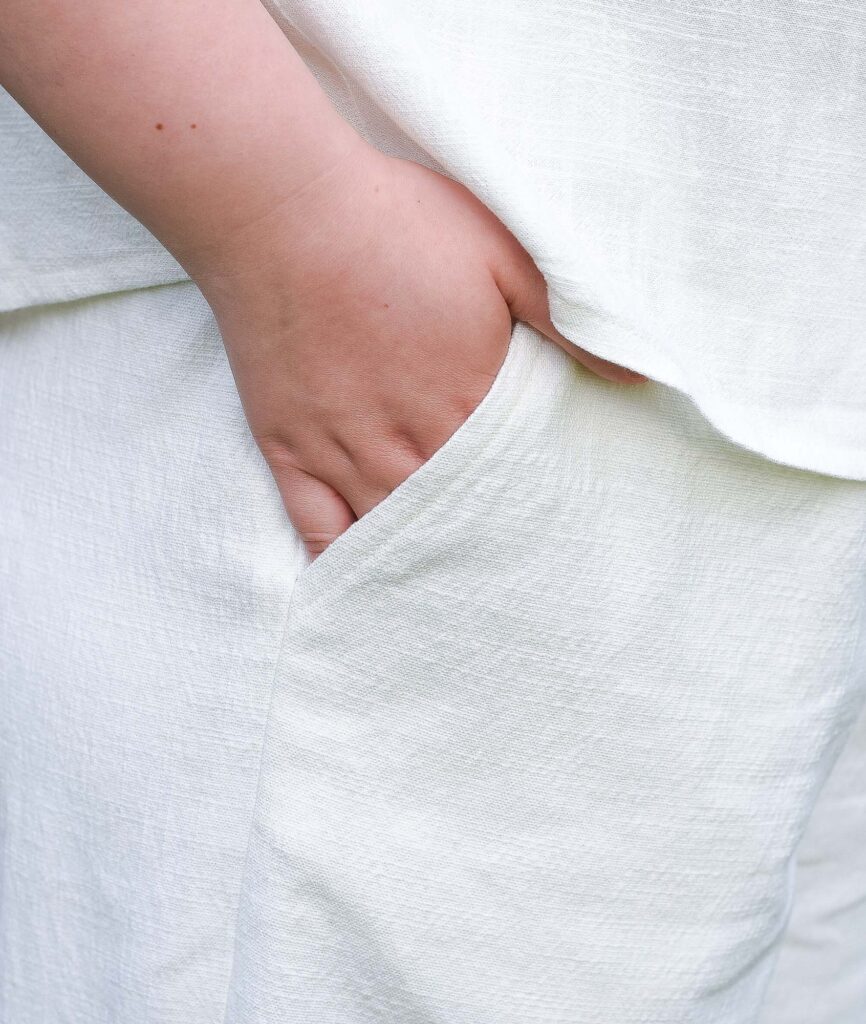 For the blouse, we opted for an off-white linen/rayon mix with a structured weave. This fabric so gorgeous up close and falls beautifully. I bought it in a fabric store here locally, but I’ve seen similar fabrics on FabFab Stoffe which has online shops in several European countries.