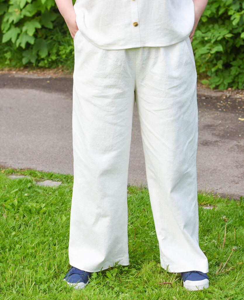 The pants are made with an elastic waist for comfort (and elastic waists on woven pants are so trendy right now, maybe it’s a quarantine/work from home thing?). This fabric, a linen/cotton/rayon/elastane is in fact from FabFab and has really great structure too. It wasn’t our first choice, however, but due to some fitting issues of the first set of pants, I had to redo them only to discover that the original fabric was sold out.
