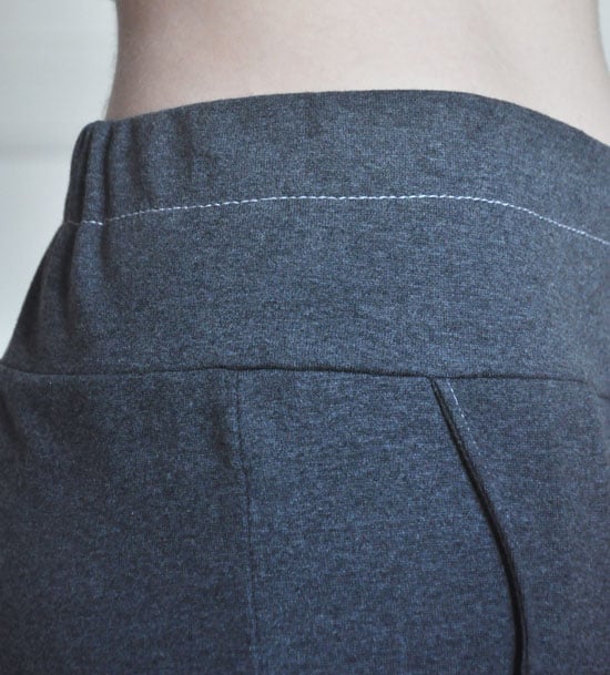 The pattern calls for a lot of top stitching, which is basically what makes the pants special. Always a scary proposition when working with knits. I do have a coverlock function on my serger, but while the the double cover seam is great for hems, I find it nearly impossible to use for curved seams, and the single cover/chain stitch seems a little unsturdy. So instead I used regular machine straight stitching, with two threads in the upper looper. This was a bit of gamble since the fabric is very stretchy. It seems to work though, I did try top stitching the leg seams as well, as the pattern calls for, but that made the seams all wobbly and stretched out. The second downside of using a super stretchy fabric was the eyelets. I did interface the back of the fabric, but one eyelet still popped and needs to be reattached. My mistake was using a stretch fusible. Next time I will go for a stiff interfacing.