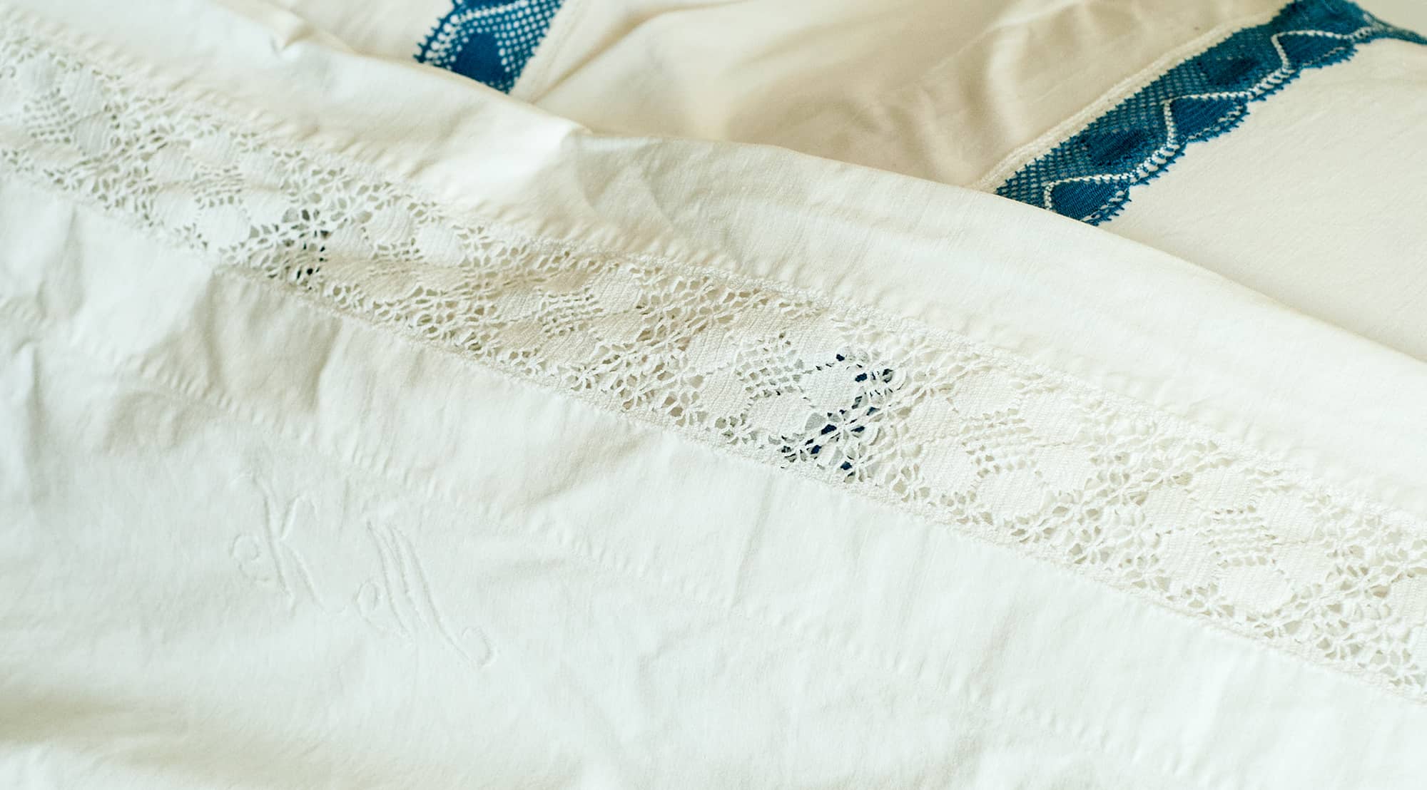 If you are using vintage sheets: Layer them with right sides facing. If the sheets have a yellow tint use a white wash product. For Swedish readers I recommend this product.