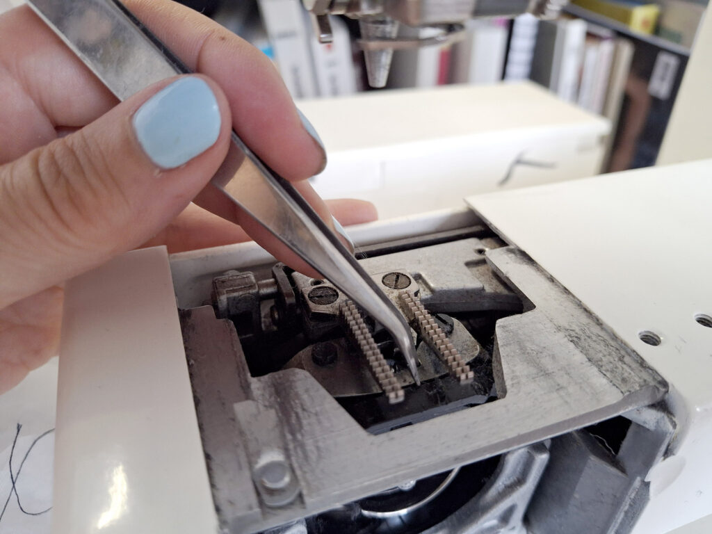 If there is thread, dust or lint underneath the metal needle plate, it can cause feeding issues, and the fabric might jam up during sewing. To prevent this, you need to clean the area underneath the plate regularly.