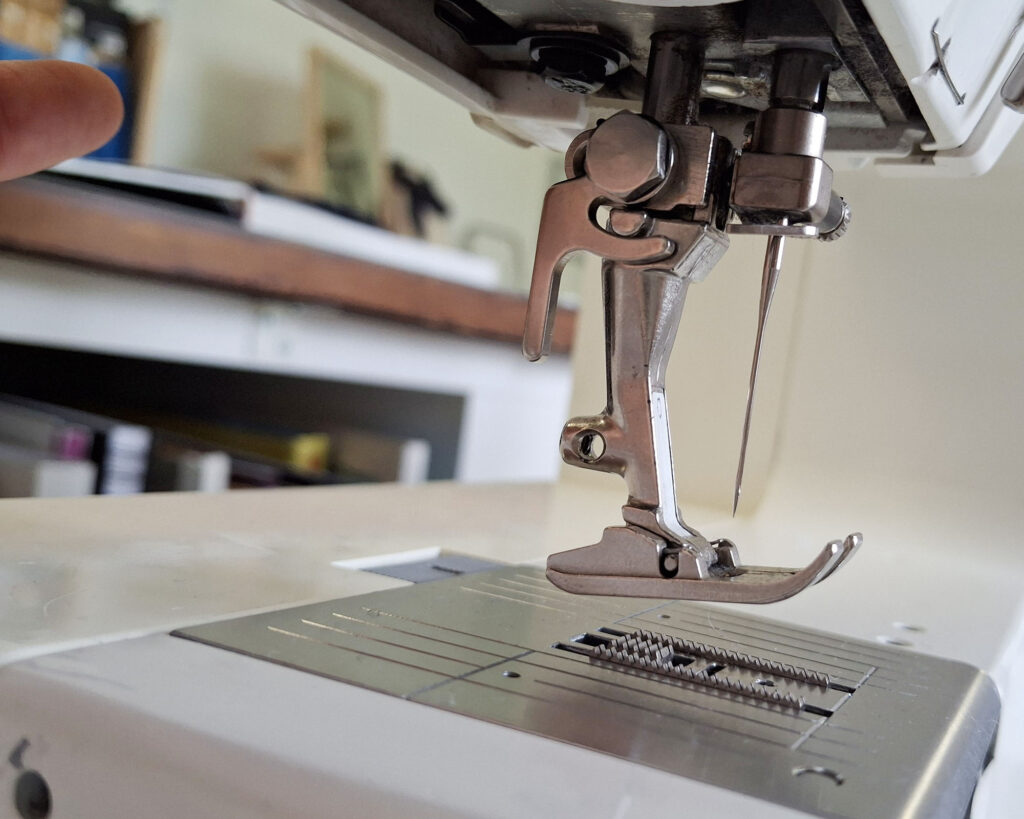When you start sewing, it’s important to ensure there is enough fabric behind the needle to prevent feeding issues and potential fabric or thread jams. Make sure the needle penetrates the fabric a bit in from the edge, rather than right at the edge itself.