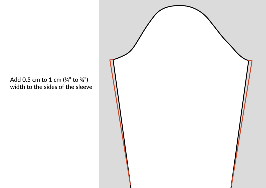 Add 0.5 to 1 cm (¼” to ⅜”) width to the sides of the sleeve. You can taper them down gradually, to retain the original hem width (see image above).