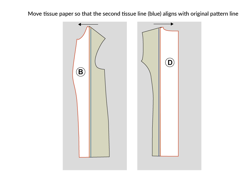 Use the lines of the original pattern pieces underneath the tissue paper. Also, true the shoulder line so that the start and end points keep their original height position.