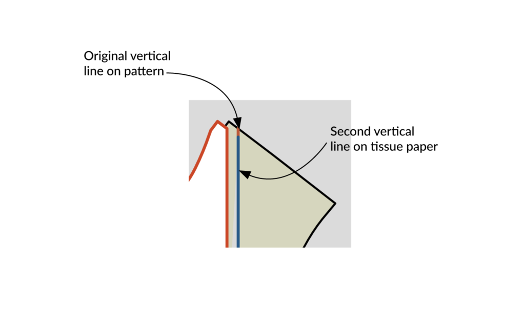 Move the tissue paper so that the second vertical (blue) line aligns with the line on the original pattern piece that we drafted in step 1.