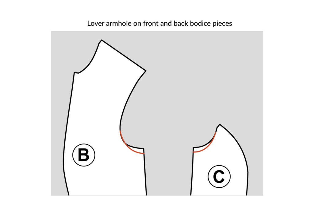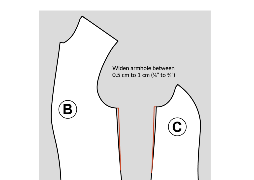 Add 0.5 to 1 cm (¼” to ⅜”) width to the armhole openings on the bodice pieces. Draw a smooth, tapered line towards the waist.