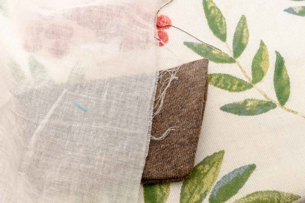 Again sew close to the edge, around 6 mm in (¼”) in. Stitch back and forth several times and backstitch to secure the loop properly. Just push the loop away to get full access to the fold underneath.
