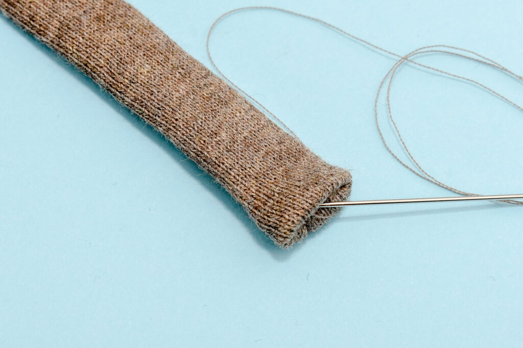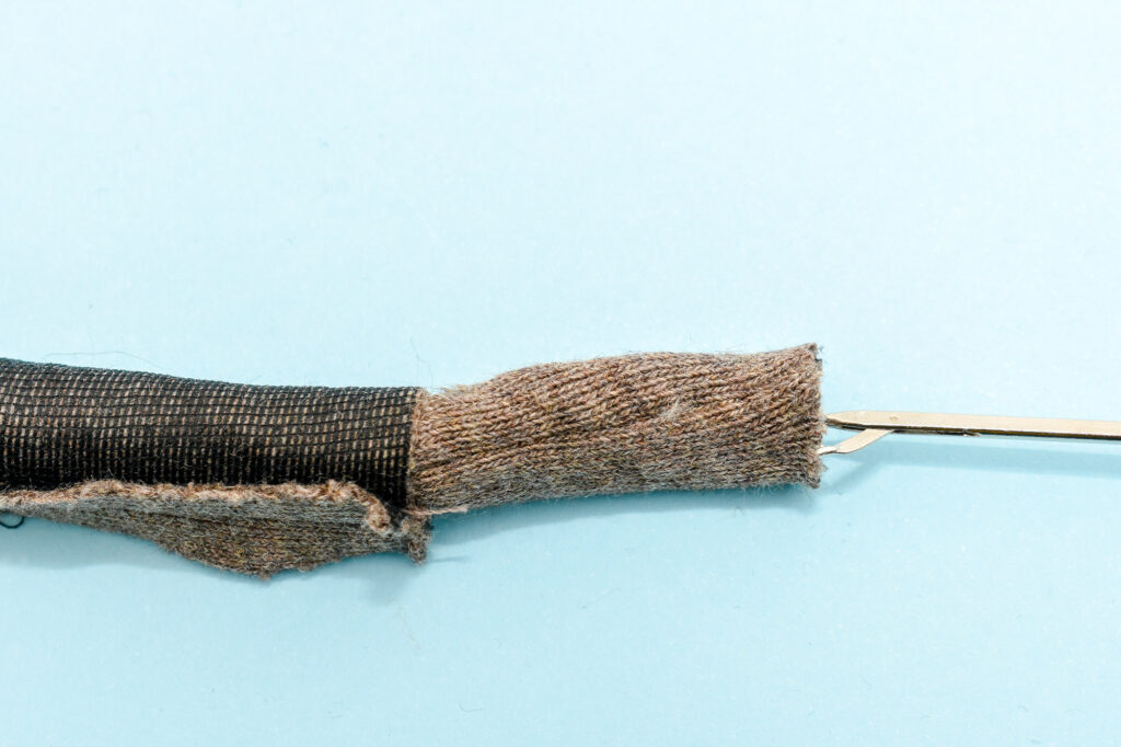 Here I am using a tube turner (Amazon affiliate link) but a needle and thread or a safety pin will work just as well. Just use your prefered method for turning loops.