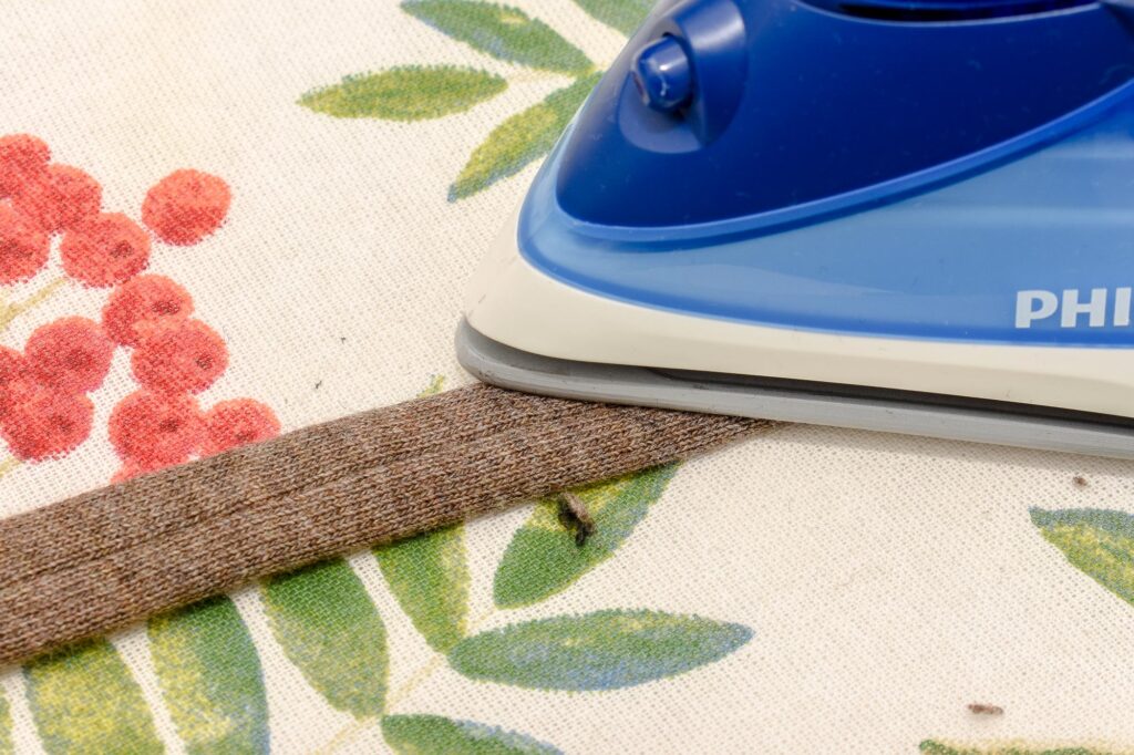 Notice how nice and crisp it looks despite being made with stretchy and soft sweatshirt fabric. This is primarily due to the interfacing and the fold and press technique used for the slanted ends of the belt.
