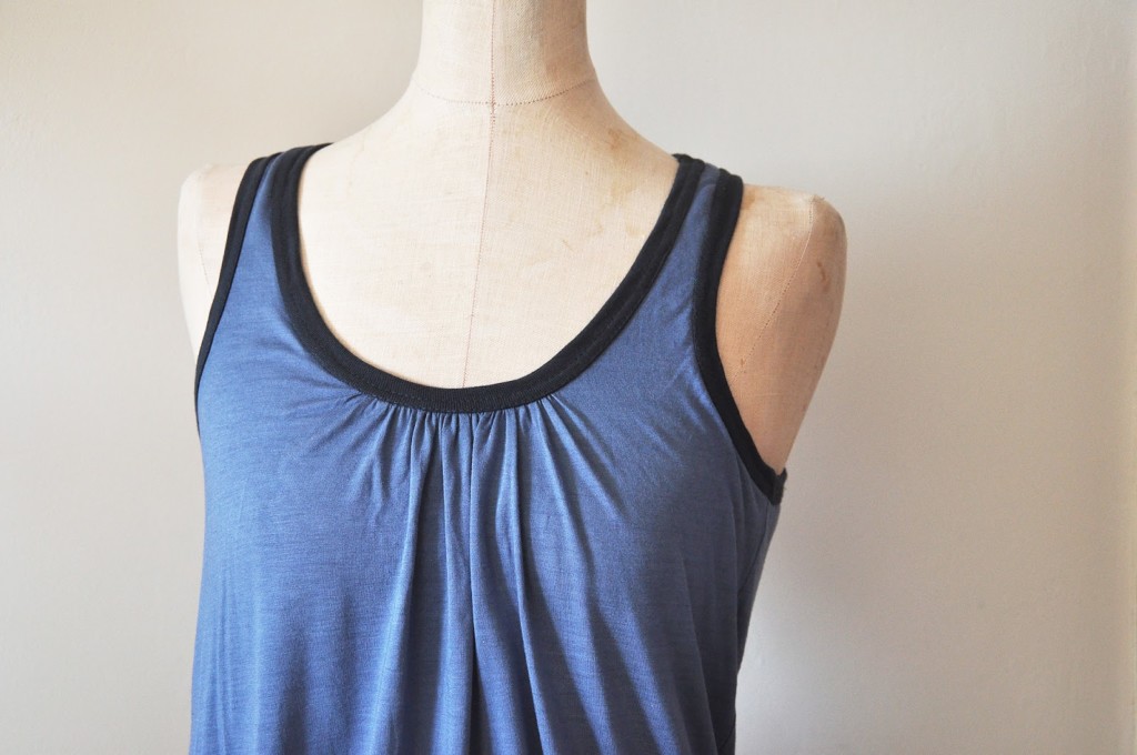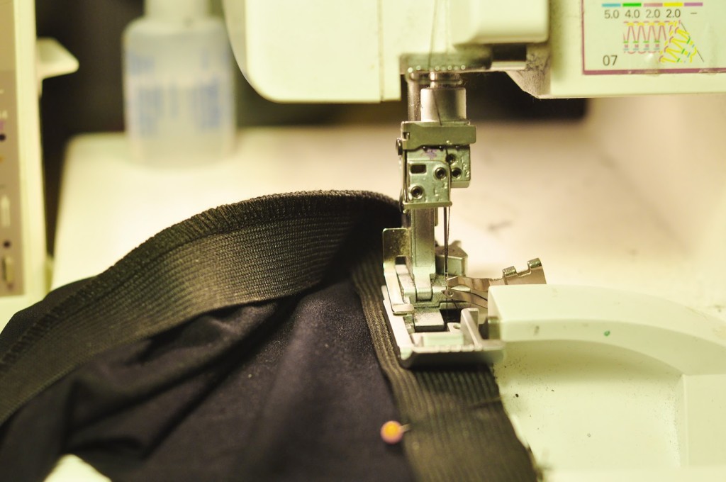 Sew the side seams and shoulder seams. Then attach the elastic. Again use your own body as a guide for the perfect elastic width. There should be some negative ease. I use the serger flatlock seam to attach the elastic as it creates the smoothest seam. But a zigzag or even better a 3-step zigzag will work just as well.