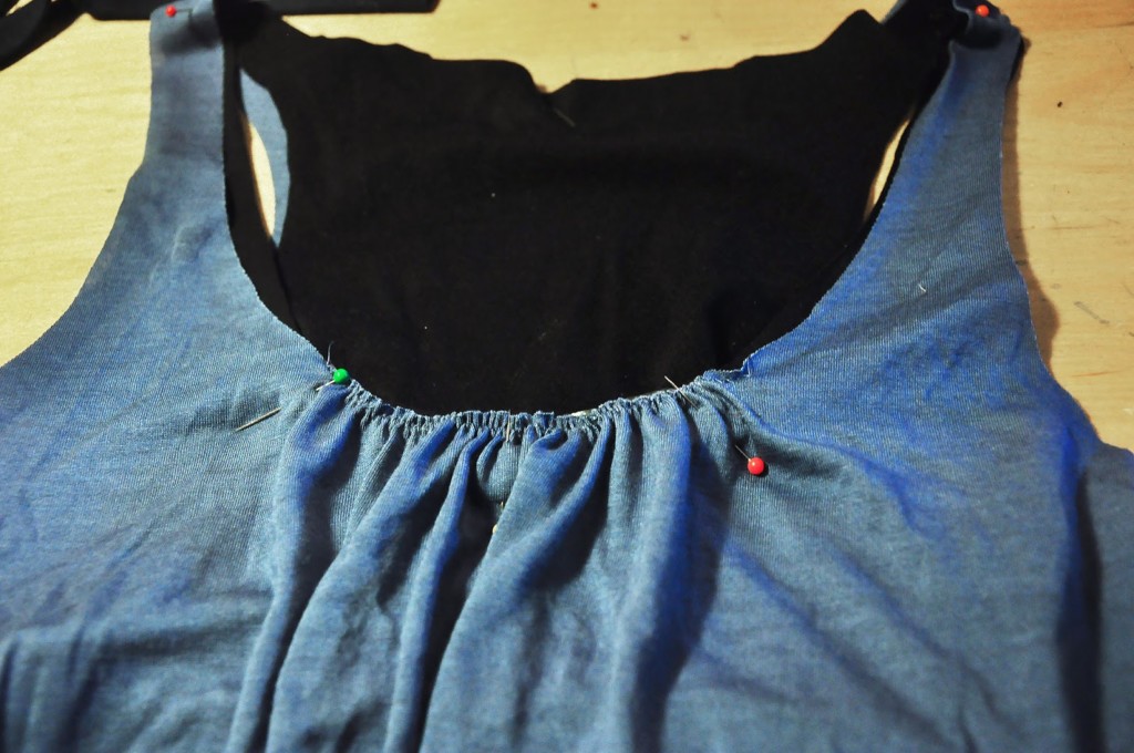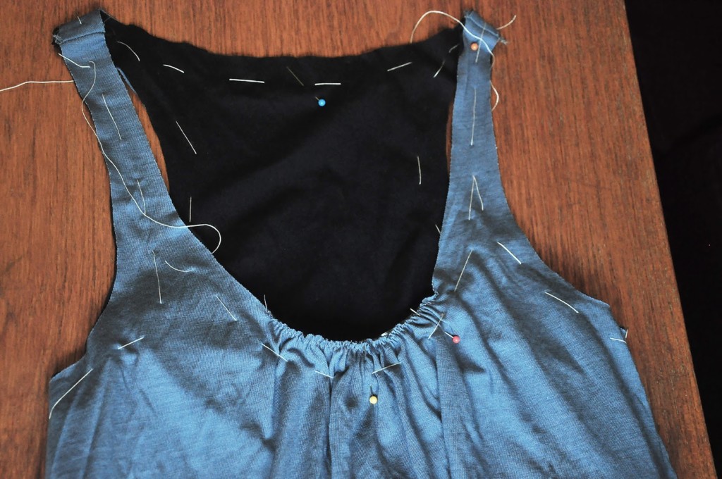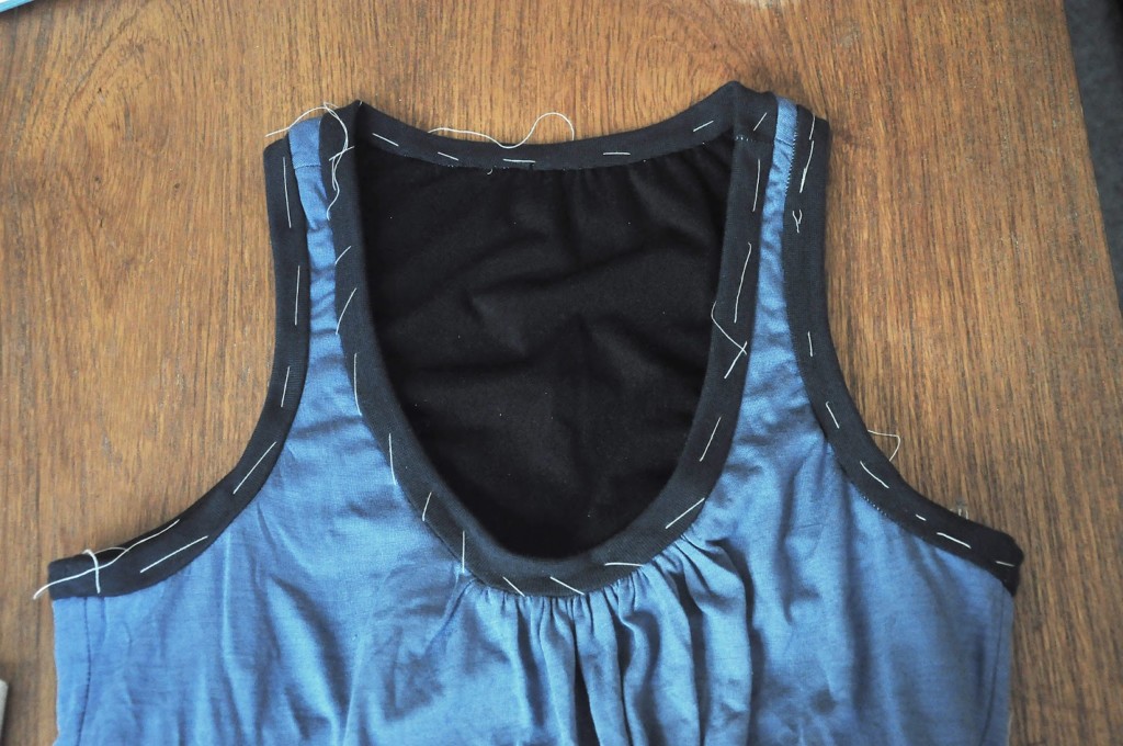Just align the bra and the top to prepare for the binding. I find basting really helpful to keep the pieces in place.