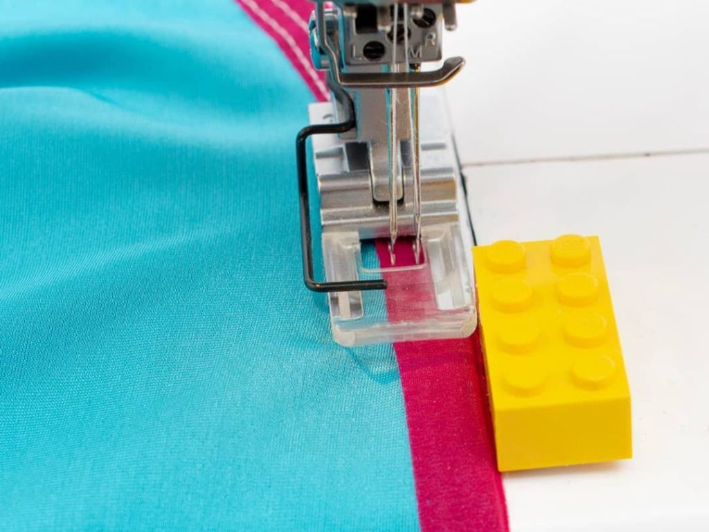 Hopefully, you already have a piece of Lego lying around. If so, use it as a seam guide. In fact, I would argue that is often better than a magnetic seam guide since you can attach the piece of lego anywhere on the sewing machine. So this Lego piece is the longer one,