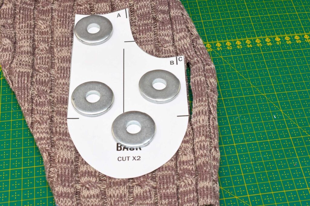 2. Place the pattern pieces on the sweater and cut