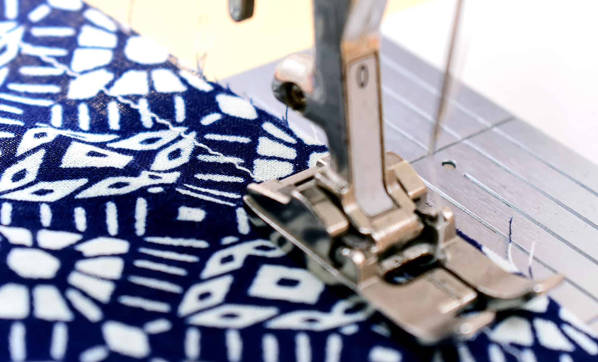 Start by sewing a row of straight stitches around 1 cm (⅖ in) from the edge. The row of stitches will be used as your guide when you are folding the hem.