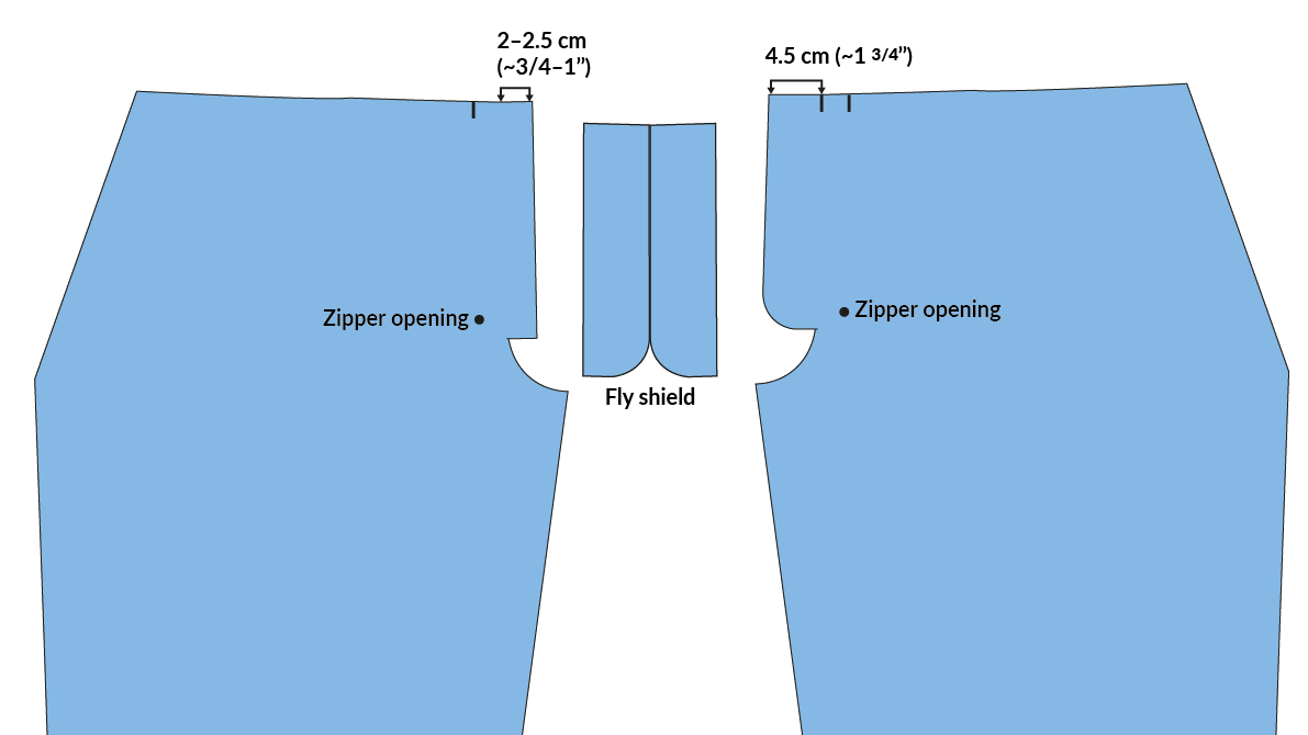 On most patterns for trousers, the extension is already added. But with this method, one side should be trimmed down to about 1″ (2.5 cm). If needed also draft a fly shield, the shield should be slightly longer and wider than the extension to fully cover everything.