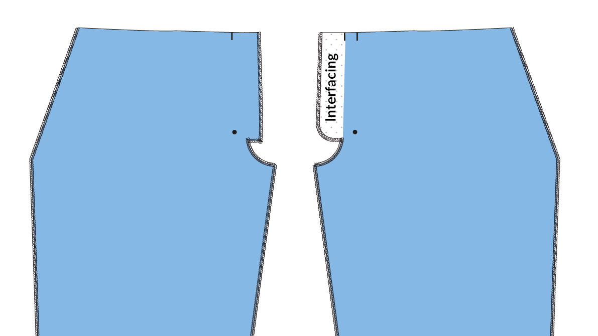 Add interfacing to the curved extension. If the fabric is very soft and supple add interfacing to the trimmed extension as well as the fly shield.
