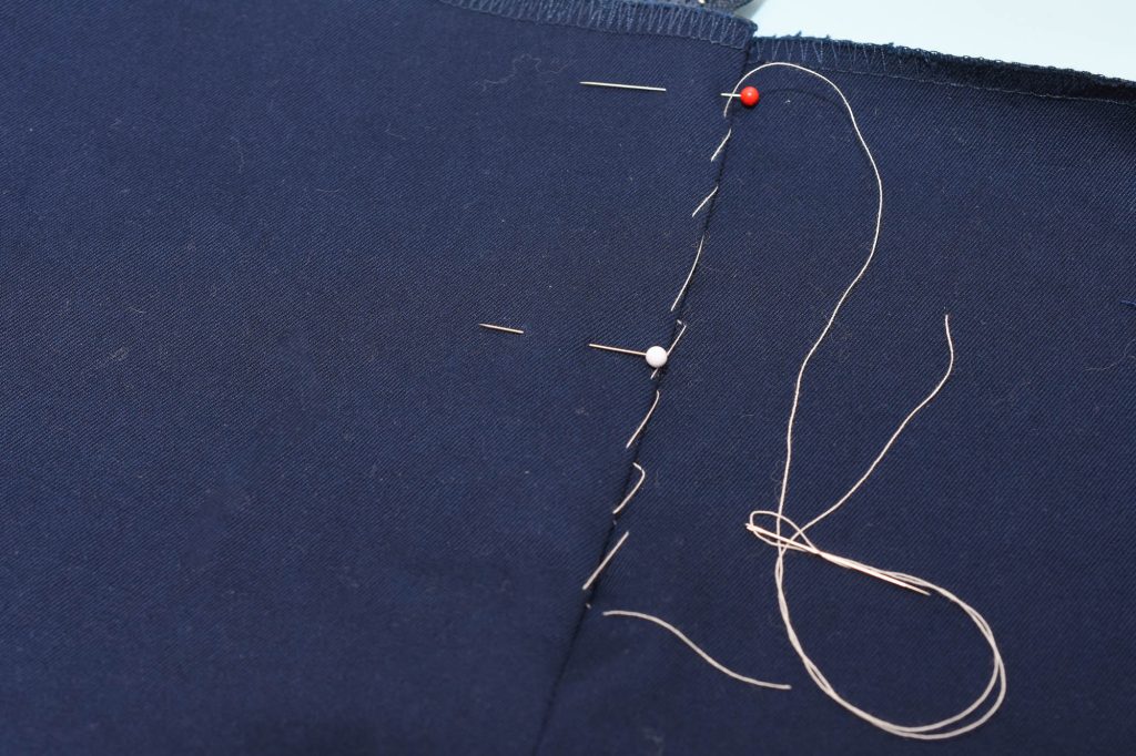 Baste together the open part of the crotch seam. This will make topstitching the zipper much easier.