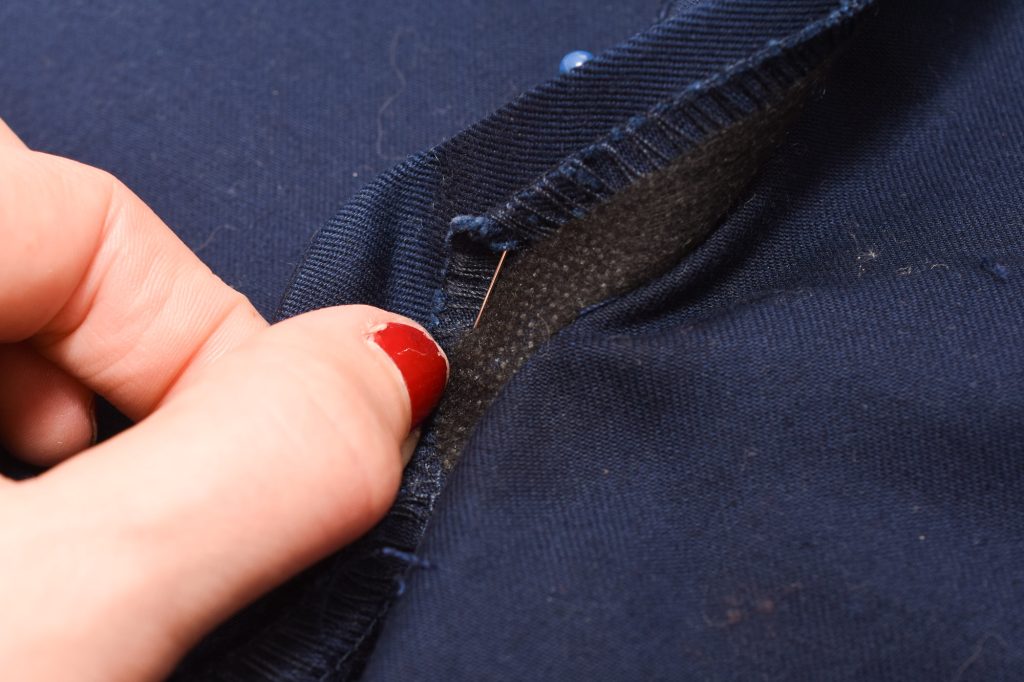 Fold back the fly shield and pin it in place. You shouldn’t stitch over it when doing the topstitching.