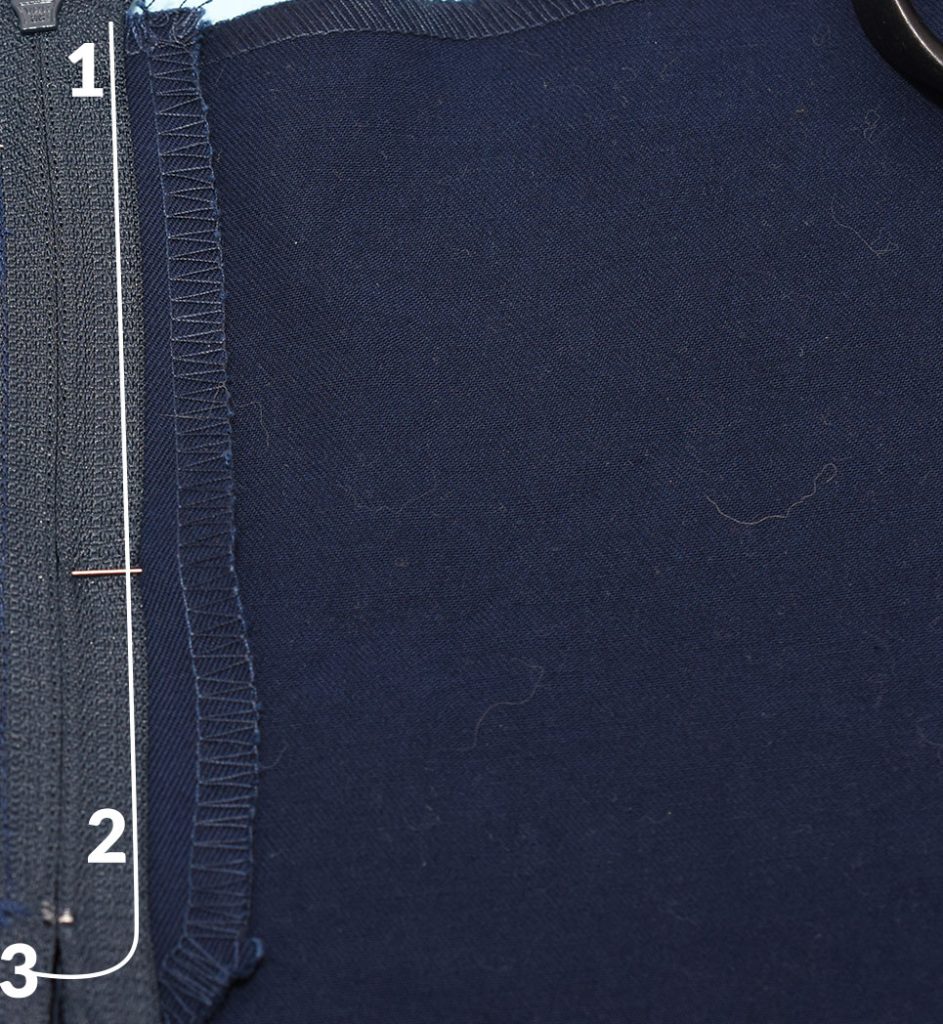 - The curve should be placed below the zipper stop and run over the zipper ends. If you place the curve too close to the zipper stop you will sew into it, and ruin the entire stitching.