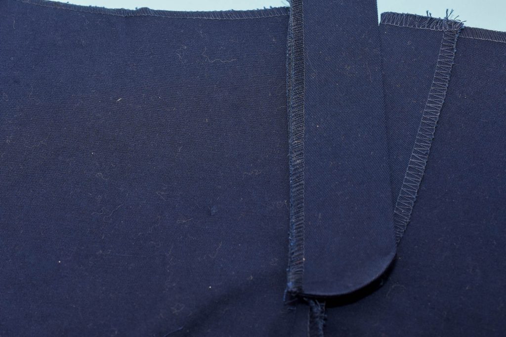 Attach the lower edge of the fly shield to the extension. You can do this by hand or by doing a few bartack stitches on the machine. This will prevent the fly shield from getting folded and flapping back and forth.