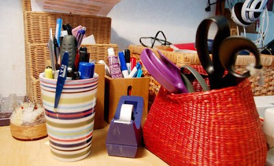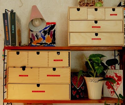 I use Ikea wooden drawers for all the notions and the vintage string shelf also hosts some beloved memorabilia from my family.