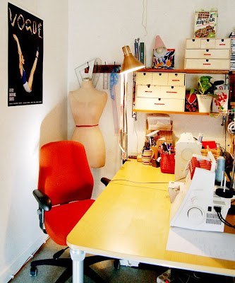 In our one bedroom apartment we are fortunate enough to have a dining room that’s now my sewing room. My boyfriend’s ‘office’ is in the living room where he uses his mother’s old desk. We are within talking distance to each other and we like that. We can do our own thing yet still be together! Your space looks great and I love the Vogue posters.