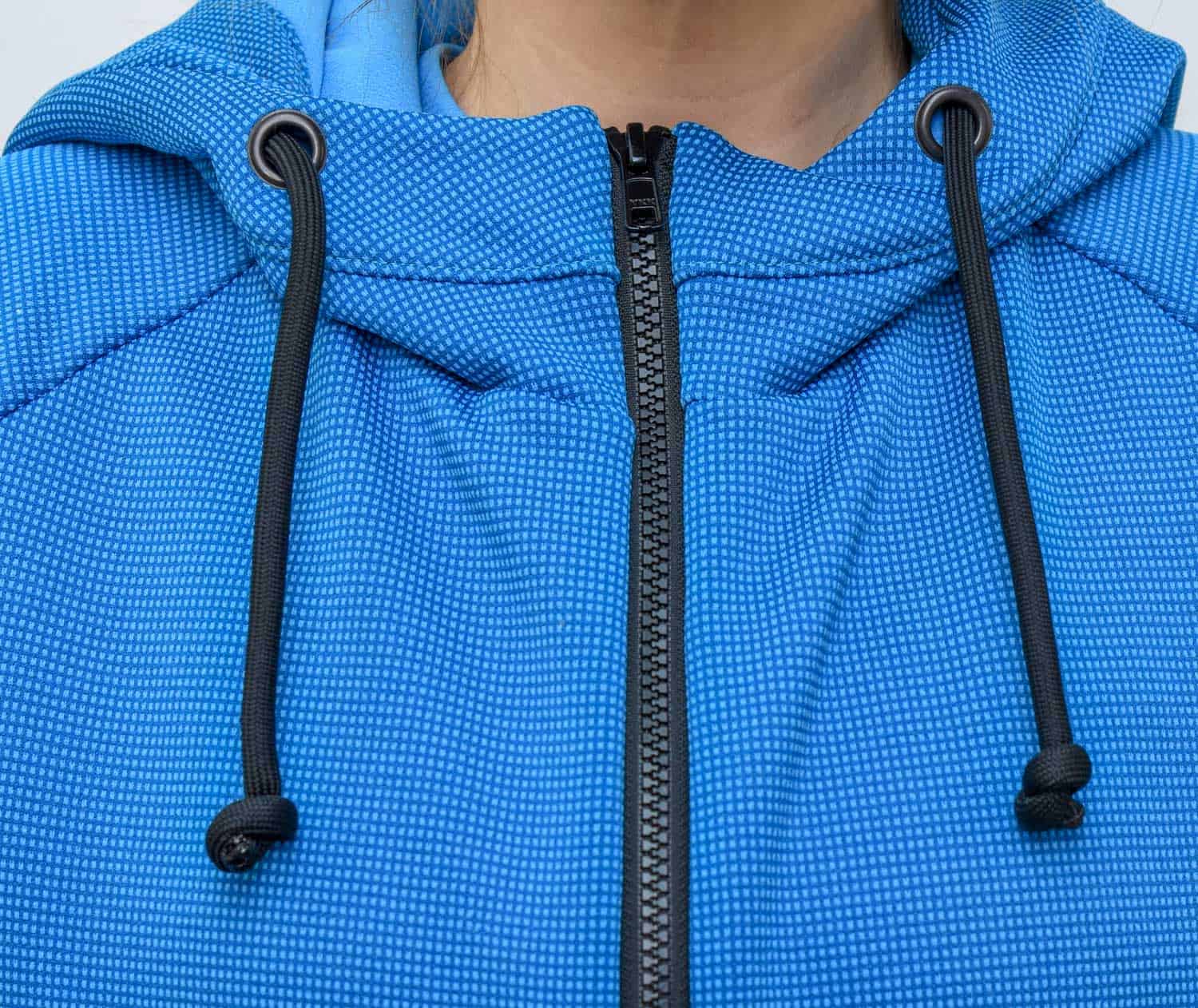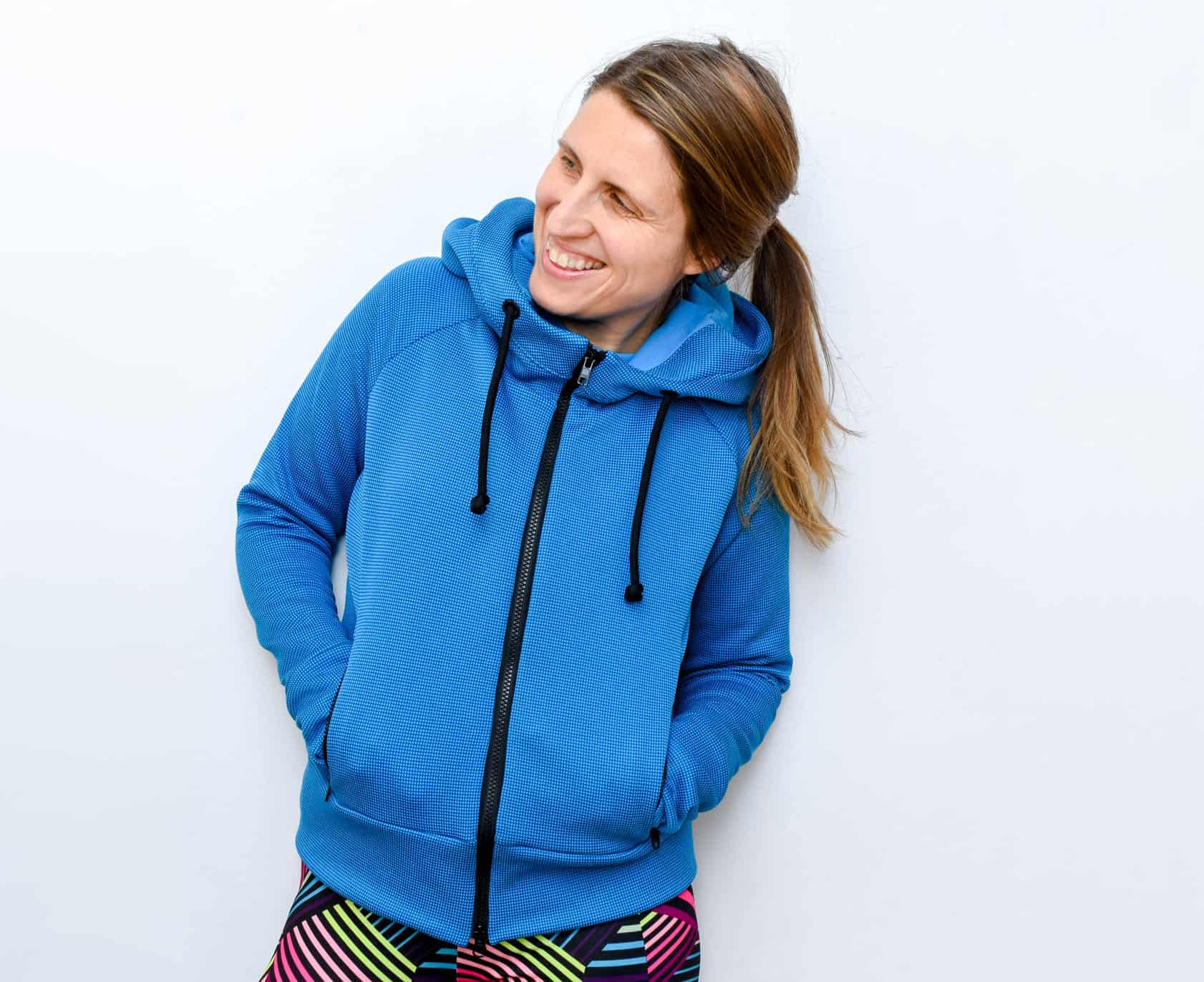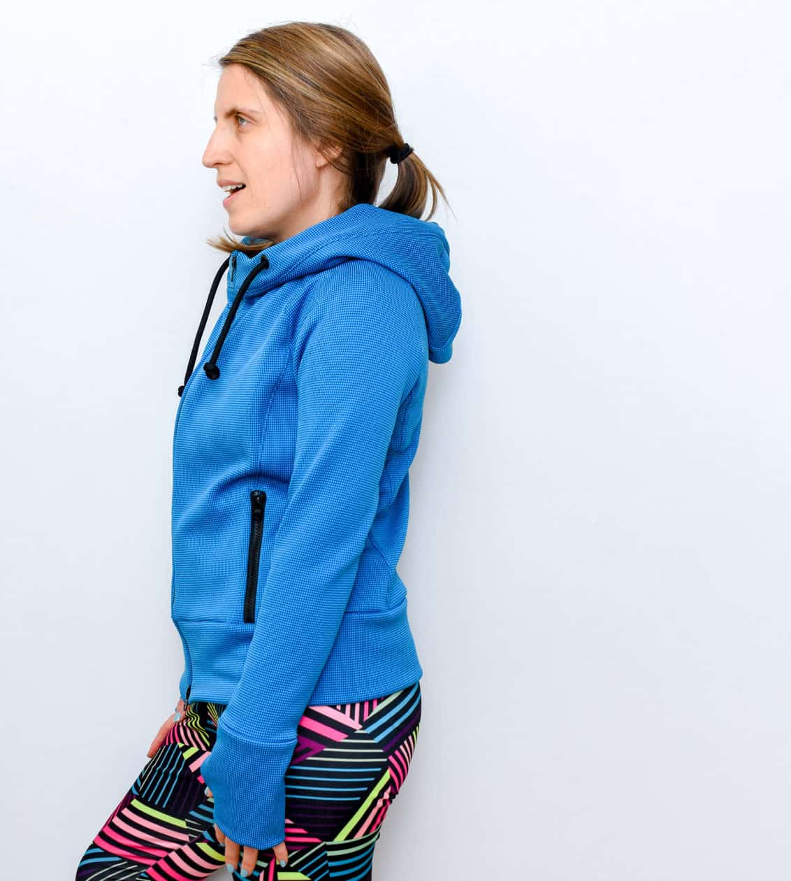 Side view. I’m super happy with the fit, it is not tight, but also not boxy. This is probably the best hoodie jacket pattern I’ve drafted so far!